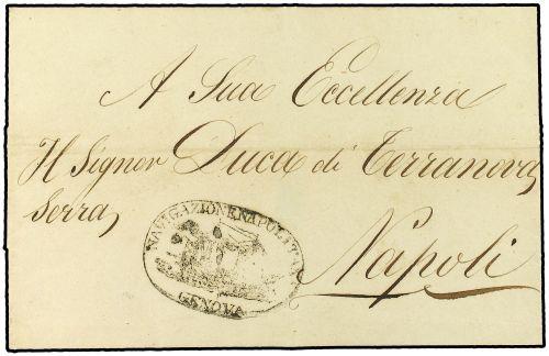 1838 Wrapper to the Duke of Terranova Serra at NAPOLI bearing illustrated agency cachet for the NAVIGAZIONE NAPOLITANA * GENOVA. No charges raised or postal markings; no doubt because of his rank.
