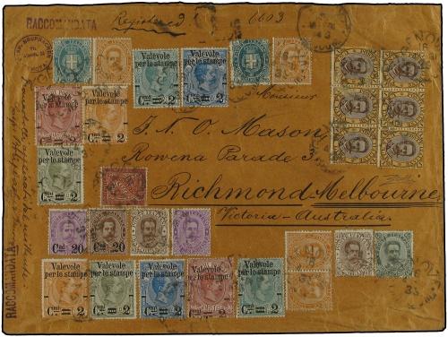 1901 (April 16) Registered cover from Genoa to Melbourne/Australia franked by no less than 29 adhesives including 1879 20c. orange (4), 1889 5c., 40c. (2), 45c., 60c., 1 lire brown and yellow in a scarce block of six, 1890 ´Valevole´ surcharged issue (9 stamps), etc. Reverse with Richmond (May 21) cds of receipt. An extraordinary cover.