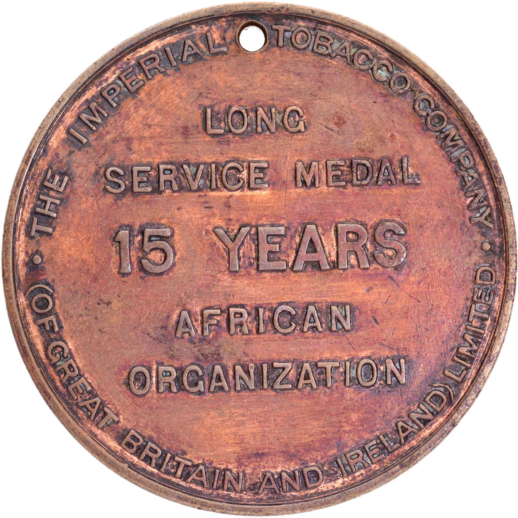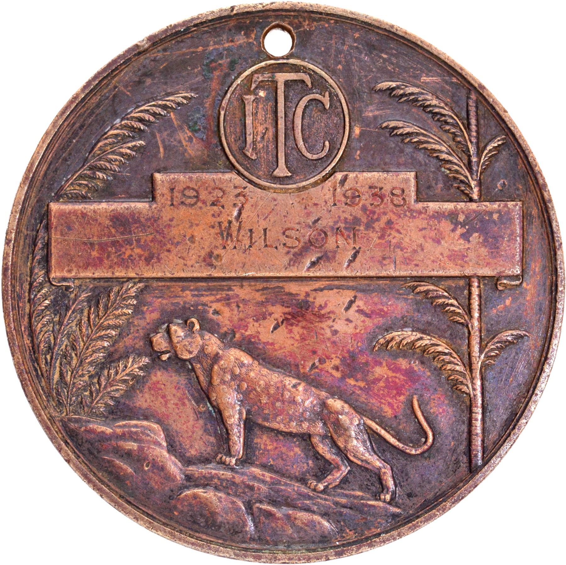 Medal, The Imperial Tobacco Company, Long Service-15 Years in African Organization, Copper Medal, Awarded to Wilson (1923-1938), Obv: a Leopard standing and ITC logo in the center, 1923-1938/WILSON inscribed on the bar at below the logo, Rev: lettering LONG SERVICE MEDAL 15 YEARS AFRICAN ORGANIZATION in the center THE IMPERIAL TOBACCO COMPANY (OF GREAT BRITAIN AND IRELAND) LIMITED around the field, along with a suspension hole without ring, 66g, 50.74mm, about very fine, Rare.