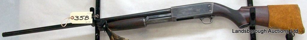 NON-RESTRICTED, PUMP ACTION, 12GA X 2 3/4", 30" BARREL WITH FIXED FULL CHOKE, SN 29986. WOOD BUTT STOCK HAS BEEN SHORTED, BLUING IS WORN AND GREY, BORE HAS SOME LEAD STREAKING.