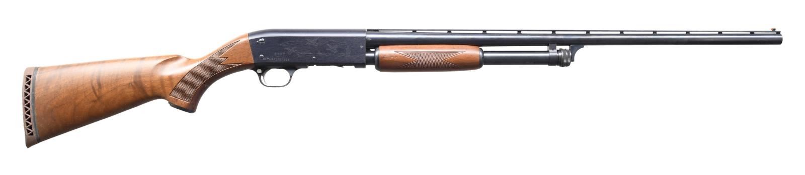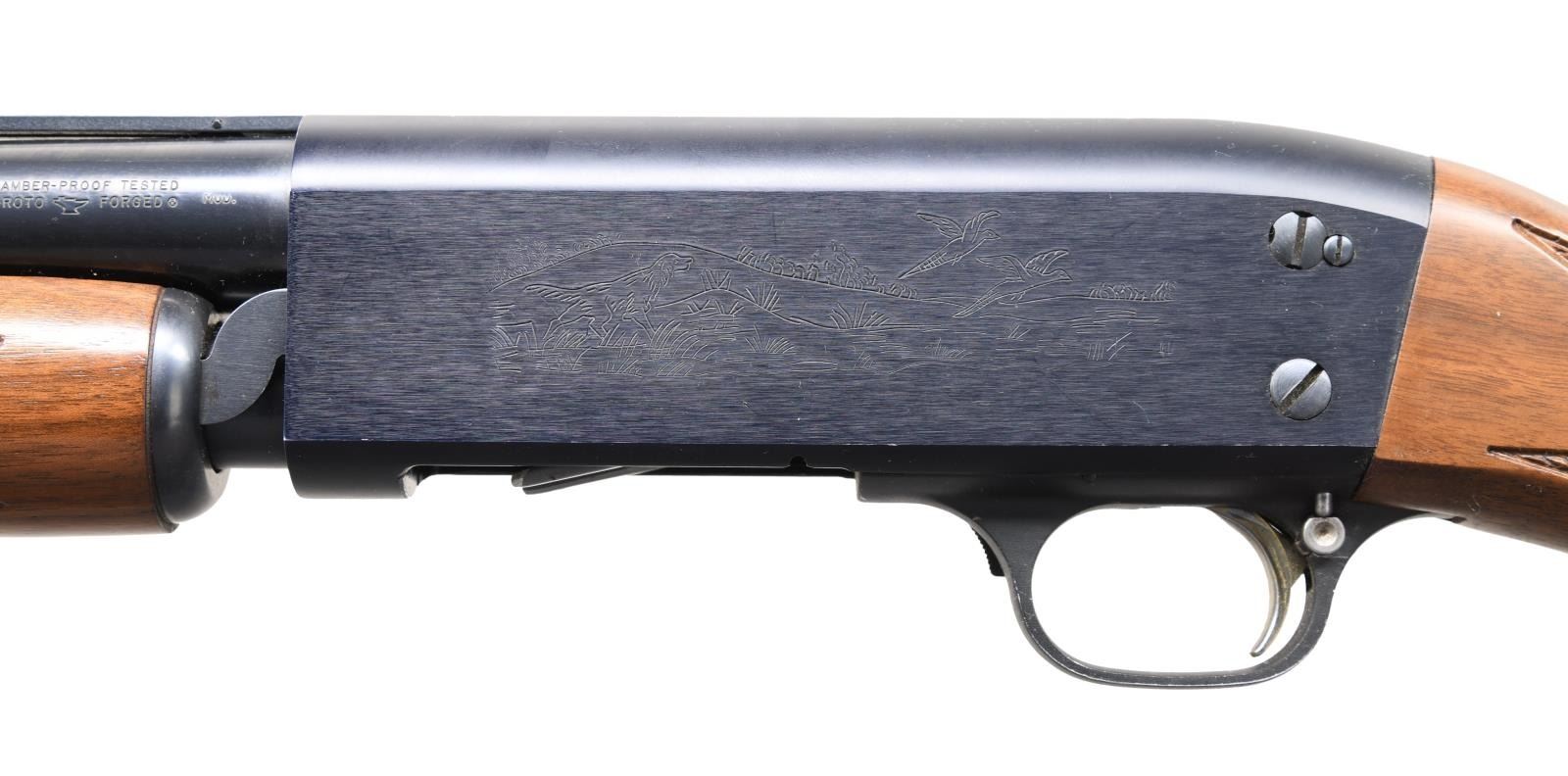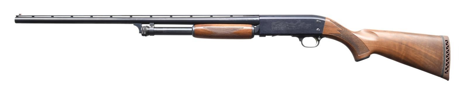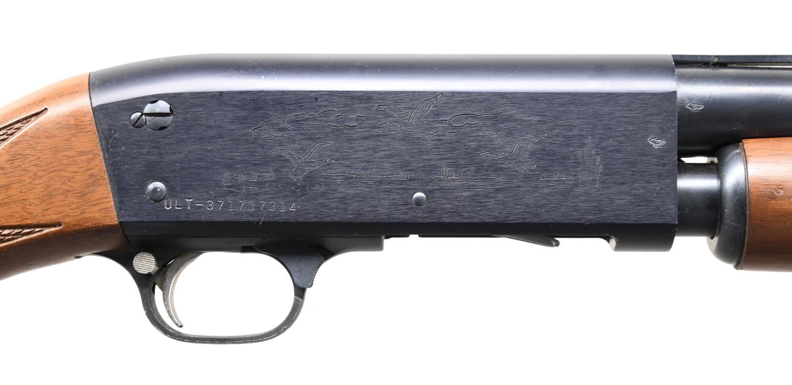 Cal. 20 ga. 2 3/4". S# ULT-371737314. Bbl. 25" vent rib w/ fixed Mod choke & Raybar front sight. Alloy action w/ game scene roll engraving. Small round slide handle & capped pistol grip stock of nicely grained walnut w/ cut checkering & original Ithacagun brown ventilated pad. WEIGHT: 5 lbs, 3.6 oz. Introduced in 1978. CONDITION: 98% blue showing slide wear & small marks. Very good original wood finish showing a few small marks. Bright near excellent bore. (23-7118/DS). MODERN. $1,000-1,500.