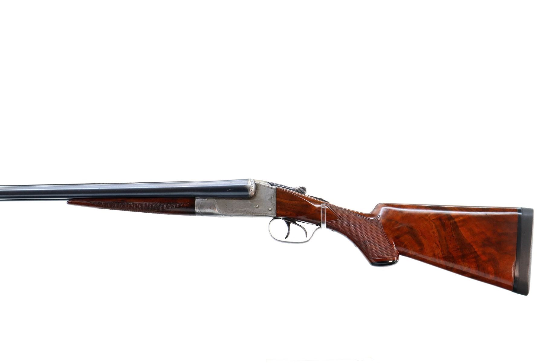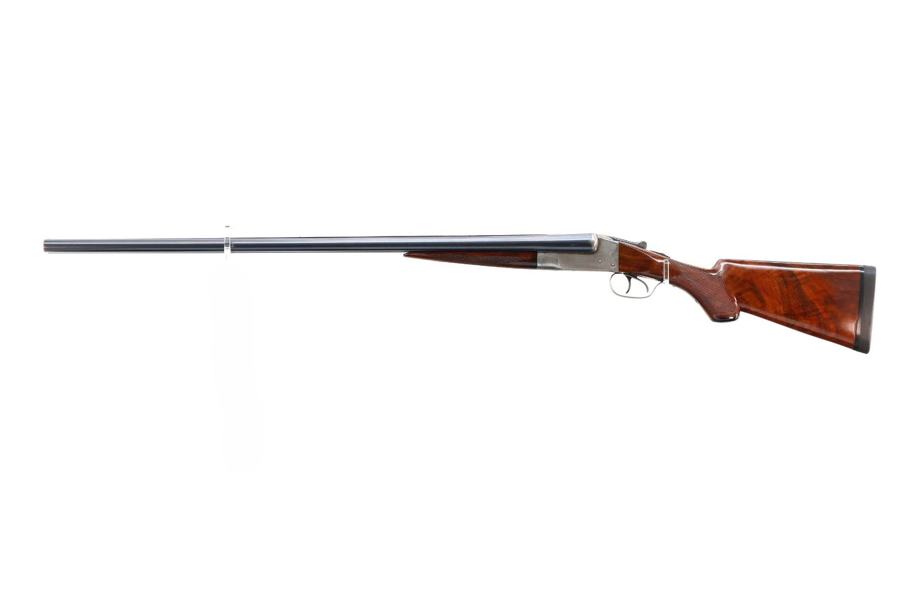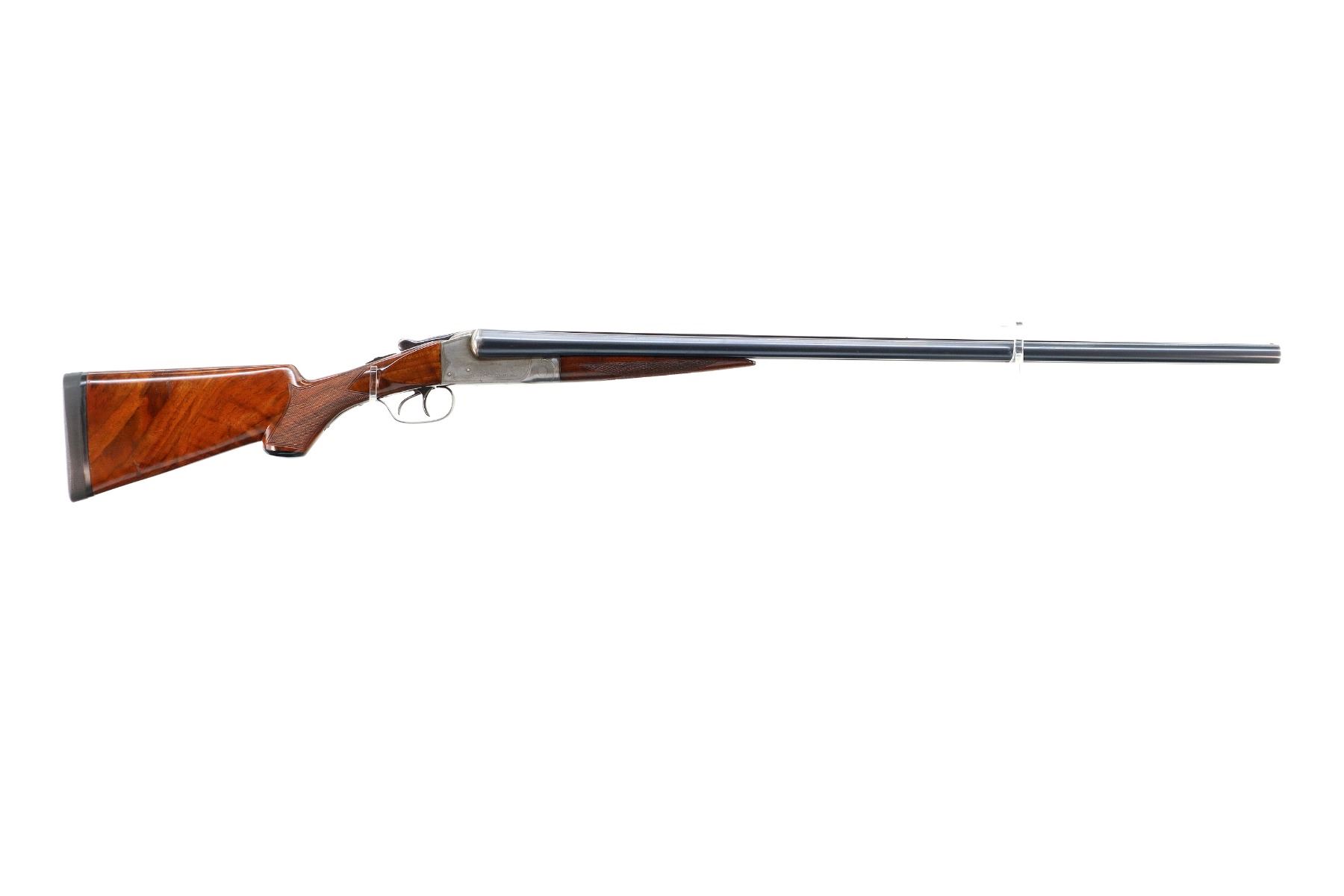 Main Description: White front and mid rib beads, blued barrels with raised rib that are slightly loose on face, engraved silver receiver, manual safety, extractor, double triggers. Two piece wood stocks, checkered splinter forearm cracked at tip, checkered pistol grip, black rubber recoil pad, 13.75" LOP, grip cap.