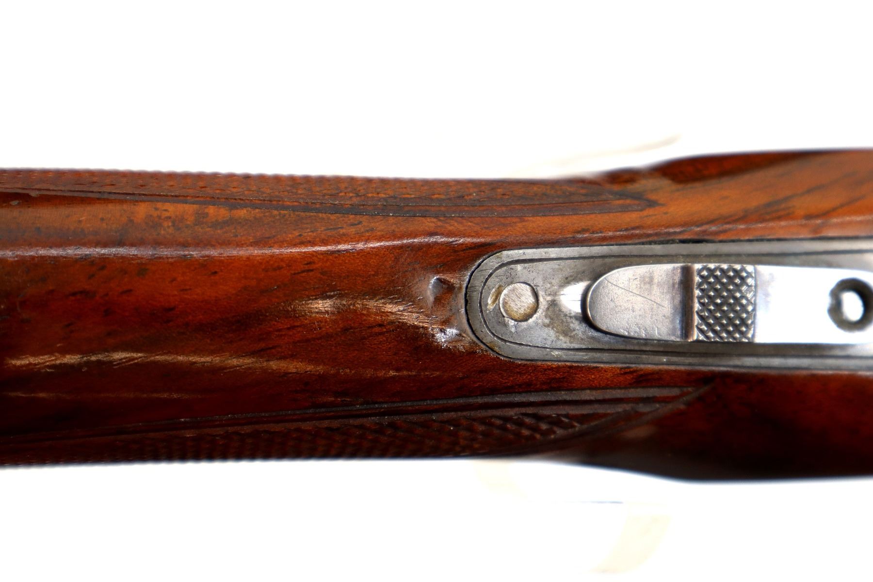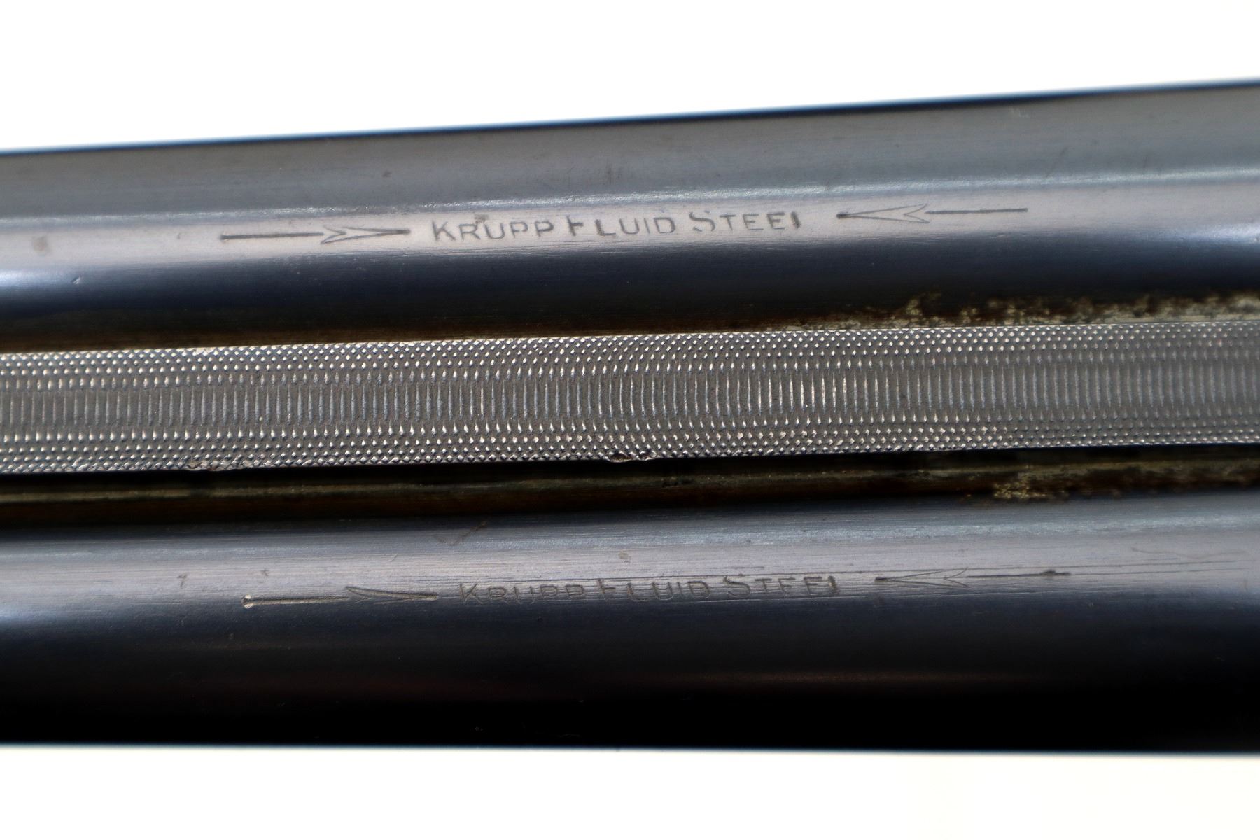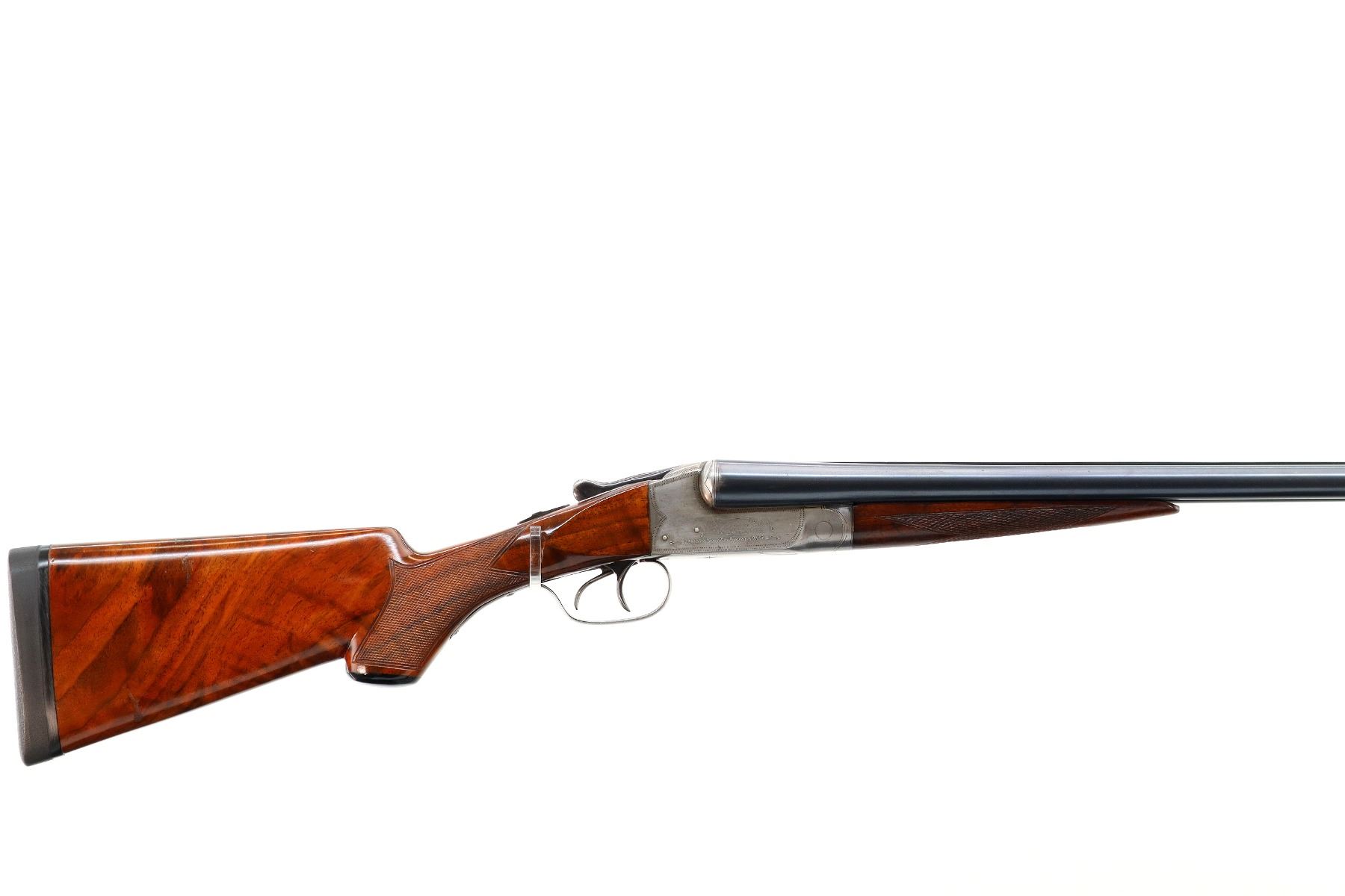 Main Description: White front and mid rib beads, blued barrels with raised rib that are slightly loose on face, engraved silver receiver, manual safety, extractor, double triggers. Two piece wood stocks, checkered splinter forearm cracked at tip, checkered pistol grip, black rubber recoil pad, 13.75" LOP, grip cap.