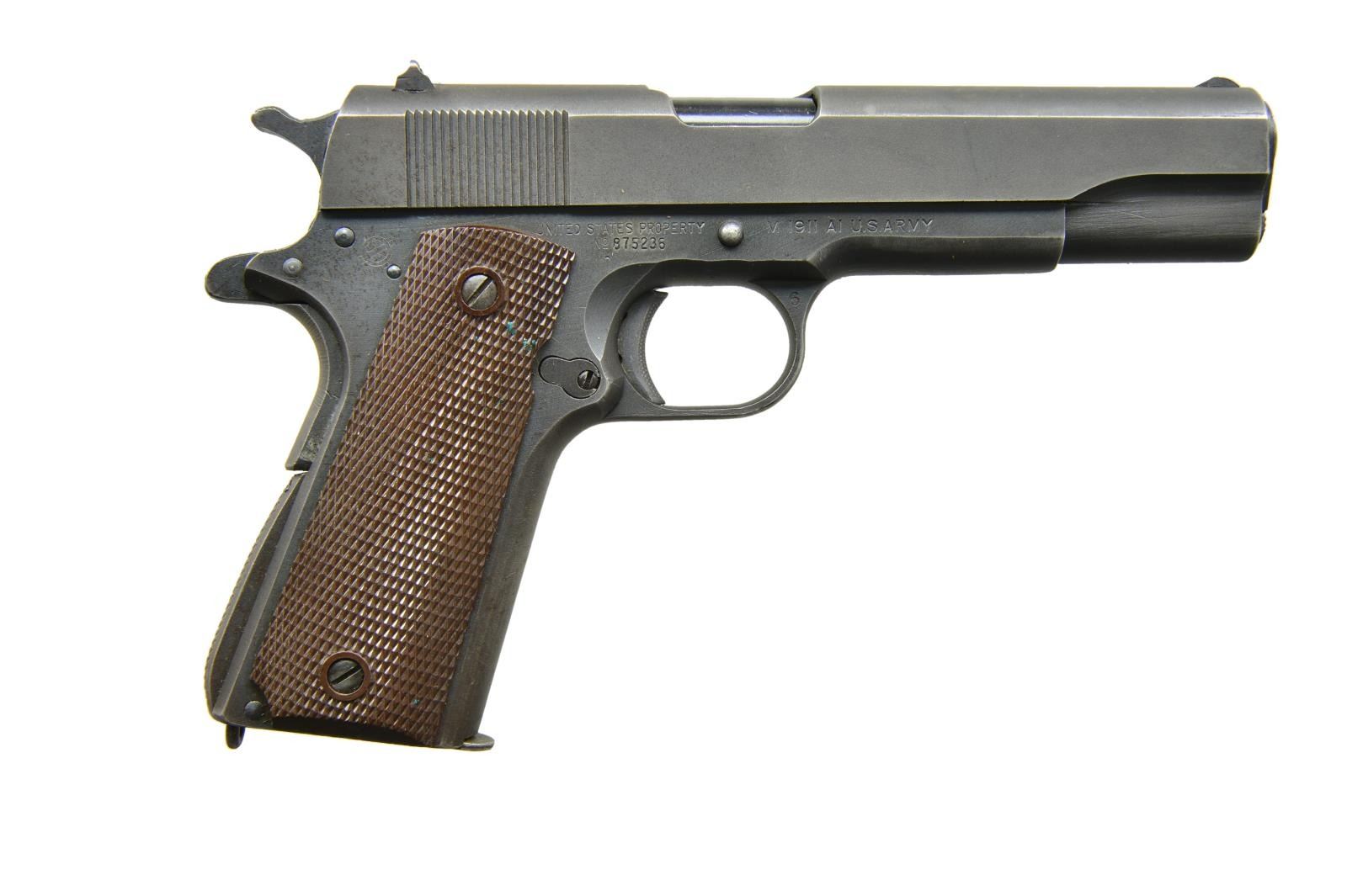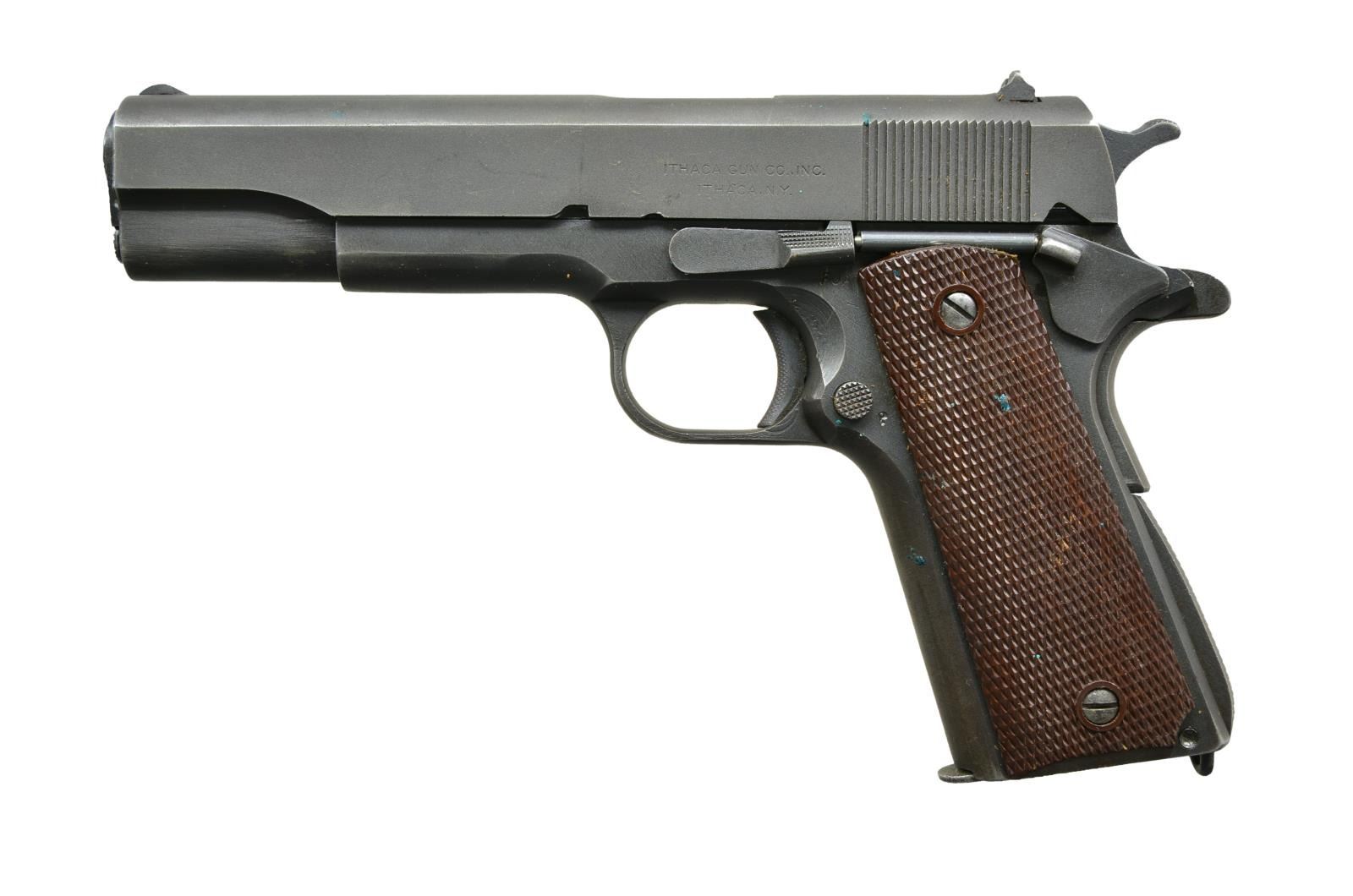 Cal. 45 ACP. S# 875236. Bbl. 5". 1943 mfg. with “FJA” inspectors mark left side frame and faint Ordnance crossed cannon right rear of frame. Fixed blade front and notch rear sights. Narrow checkered spur hammer, stamped trigger, checkered magazine release and arched mainspring housing. High Standard barrel marked “HS” on the lug. Keyes Fibre brown checkered grips. MAGS: 2-7 rd. unmarked parkerized. UNATTACHED ACCESSORIES: soft zippered pistol rug, 1943 dated Froehlich dual magazine pouch and a US M3 Shoulder holster by Enger Kress. Leather is flaking, worn and missing the bottom grommet and was restitched to hold the retention strap in place. CONDITION: metal retains about 90% original thinning and fading finish with the front gripstrap a brown/gray patina. Grips retain strong checkering and some dried verdigris. Bore is very good, bright and strong. (22-4395/CW). CURIO. $1,500-2,000.