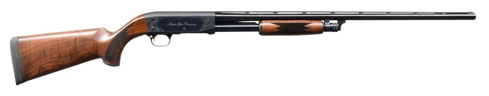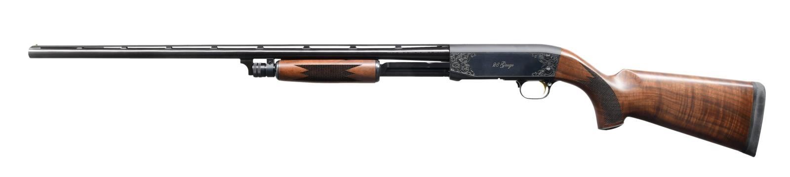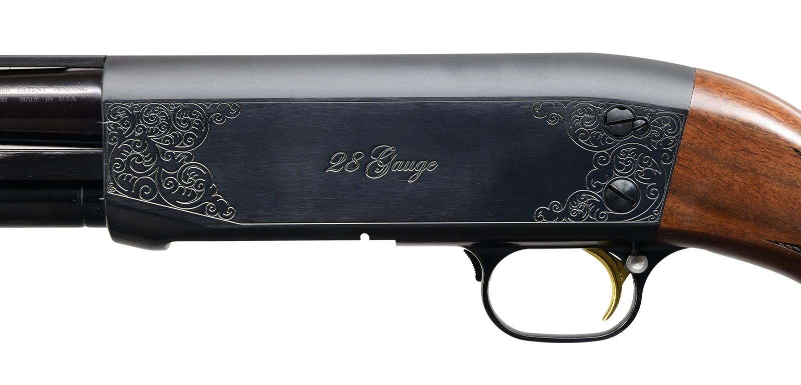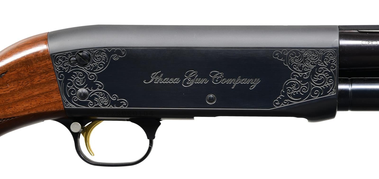 ACTION SHOTGUN. Cal. 28 ga. 2 3/4". S# M3728080104. Bbl. 26" vent rib w/ interchangeable chokes. Full, Mod & IC tubes included. Brass front bead. Bottom ejection action w/ highlights of scroll ornamentation. Gold finished trigger. Bolt bottom is jeweled. Small round forearm & capped pistol grip stock of satin finished fancy walnut w/ cut checkering. LOP: 13 1/2" over black Decelerator pad. Introduced in 2007. UNATTACHED ACCESSORIES: Ithaca Gun Company certificate of authenticity certifying registration of this 28 ga. gun. Original foam lined box containing owner's manual, spare chokes, wrench, plug & gun cover. CONDITION: near excellent. Over 98% blue showing slide wear. Bright near excellent bore. (23-7317/DS). MODERN. $1,000-1,500.