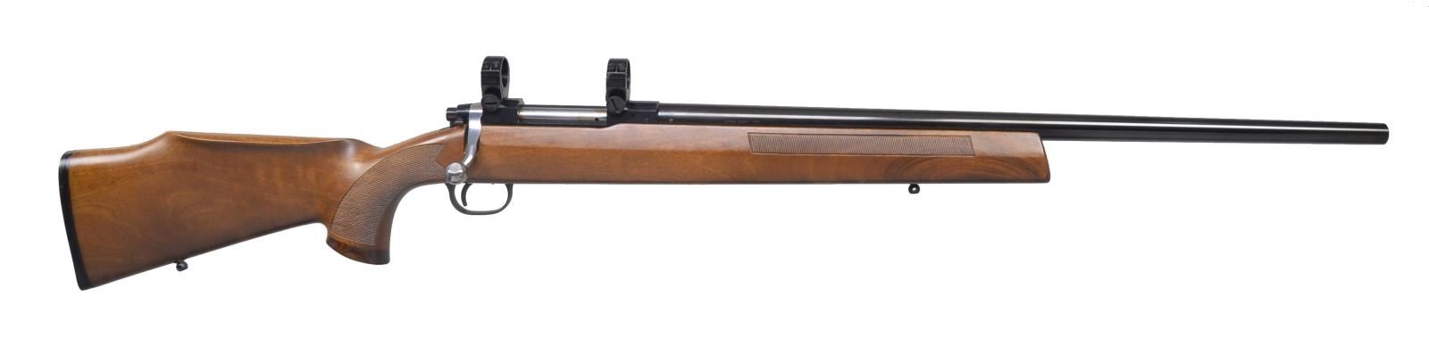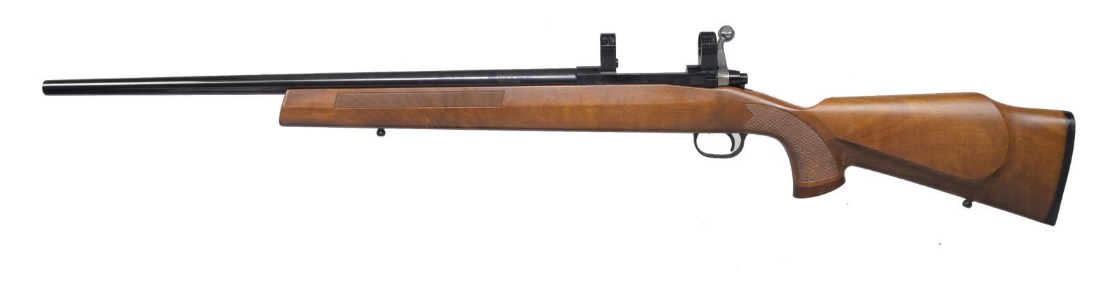 Cal. 22-250. S# 550-128099. Bbl. 24 1/2" rnd. bbl. made w/ out sights. Receiver equipped w/ scope rings. 1 Detachable box mag. Beaver tail forend on stock w/ serrated panels on each side. Checkered pistol grip w/ contrasting wooden grip cap. Black solid recoil pad marked “ITHACA”. Left side cheek piece. Sling swivel studs. CONDITION: bore is very good. (20-3175/BT). MODERN. $500-800.