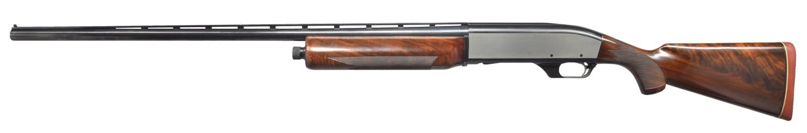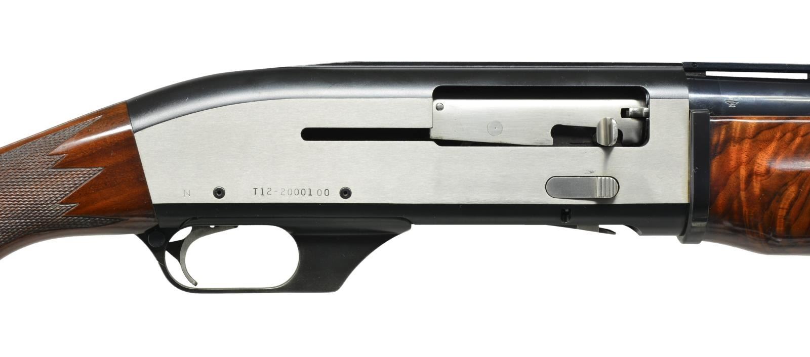 Cal. 12 Ga., 2 3/4". S# T12-2000100. Experimental gun in 12 Gauge built on the Ithaca Mag 10 action. The gun never reached the production stage. Steel frame w/ matte finished upper & lower surfaces & polished sides. Right side of receiver marked "N" behind rear trigger pin followed by S# between trigger pins. Bbl. 30" VR of Roto Forged steel w/ standard proof tested markings. Fixed Full choke. White target front sight & steel mid bead. Forearm & capped pistol grip stock of gloss finished fancy walnut w/ borderless point pattern cut checkering. LOP: 14 3/8" over solid red Presentation pad. Drop: 1 5/8" to parallel comb. WEIGHT: 9 lbs., 8 oz. CONDITION: wood & metal retain over 98% original finish showing a few sm. marks. Very good bore. (21-338/DS). MODERN. $1,350-2,000.