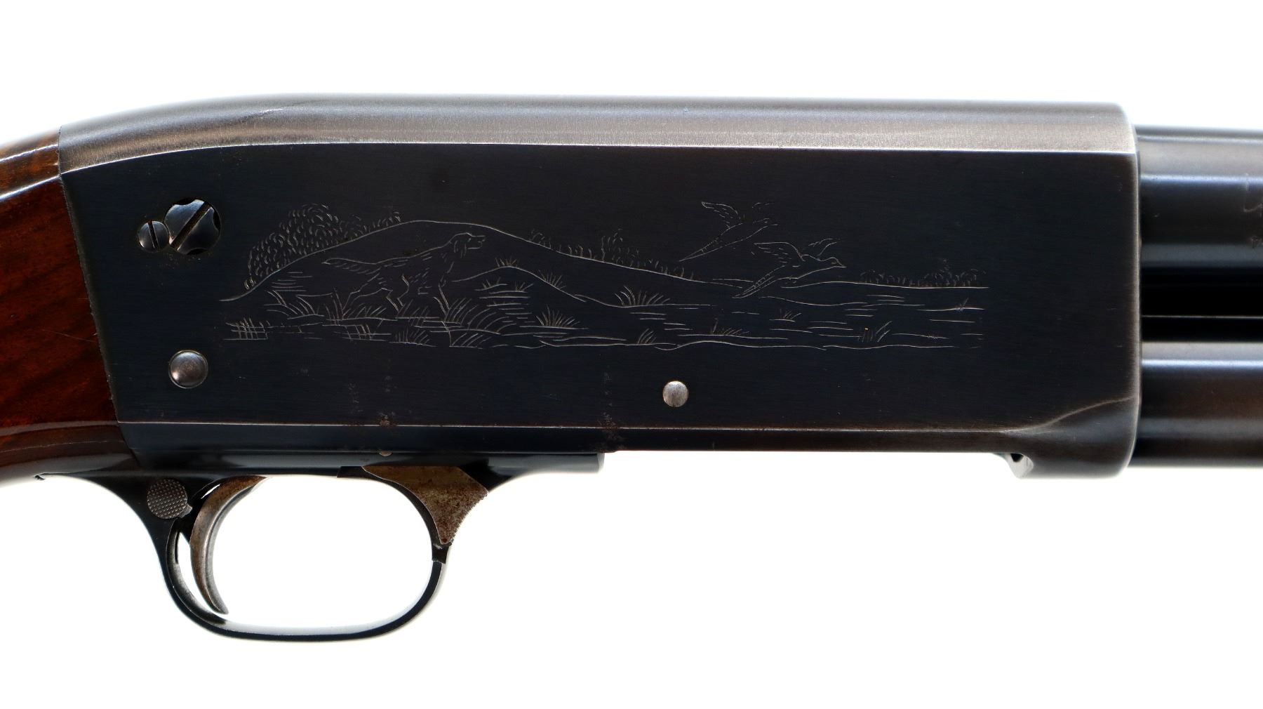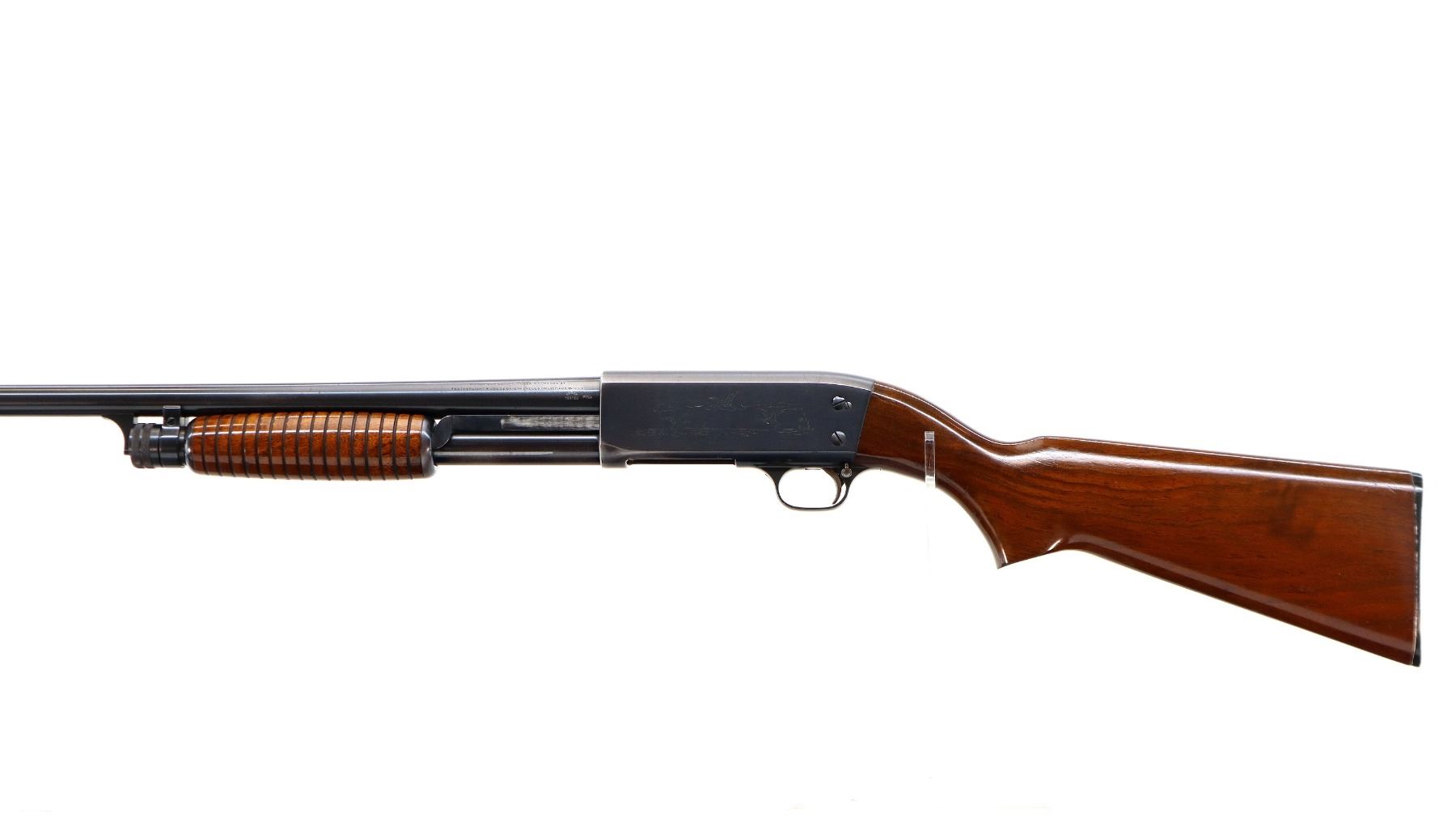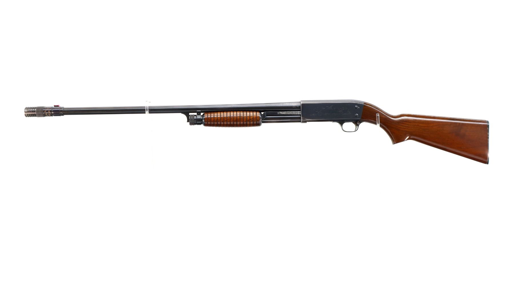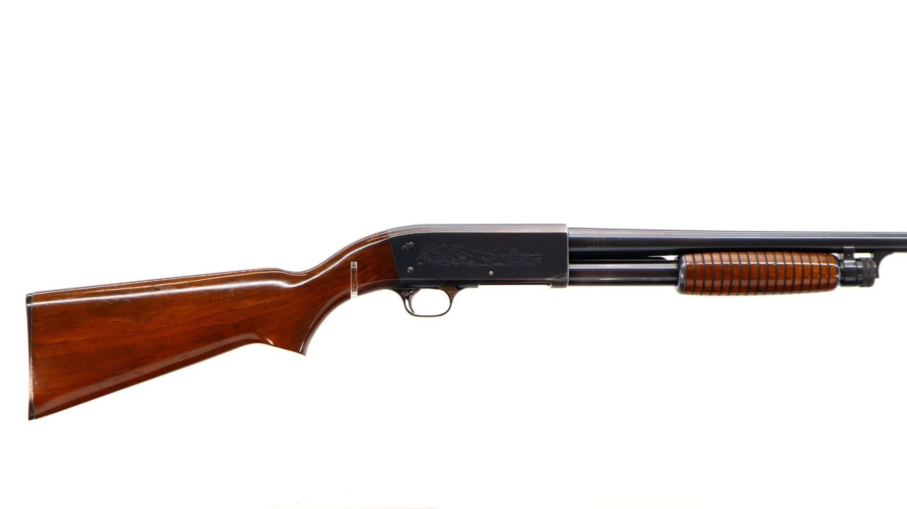 Main Description: Orange front bead, blued finish, round barrel, engraved receiver. Two piece wood stocks, grooved forearm, pistol grip, grooved black polymer butt plate