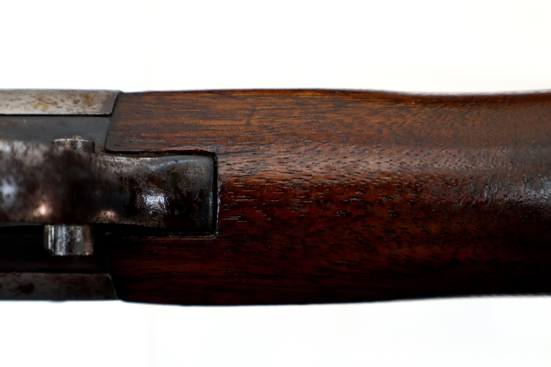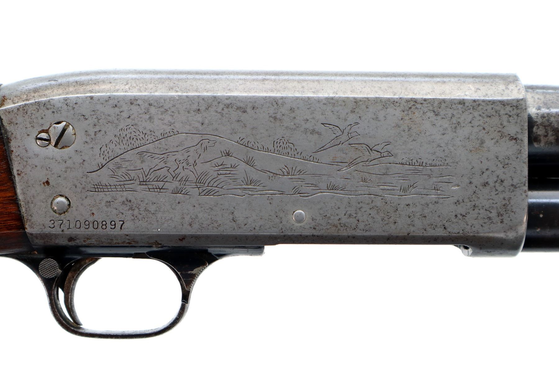 Main Description: Broken bead, round barrel, engraved receiver. Two piece wood stocks, checkered forearm and pistol grip cracked behind receiver, red vented rubber recoil pad, 14.25" LOP, grip cap.