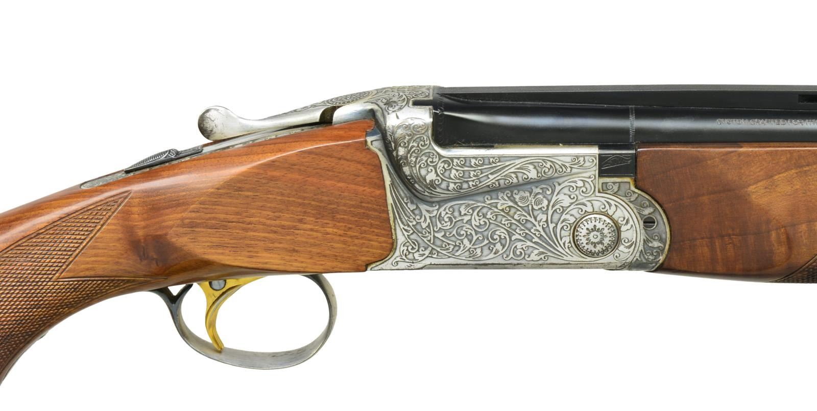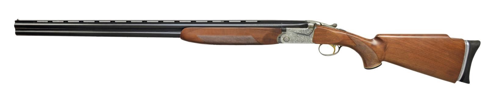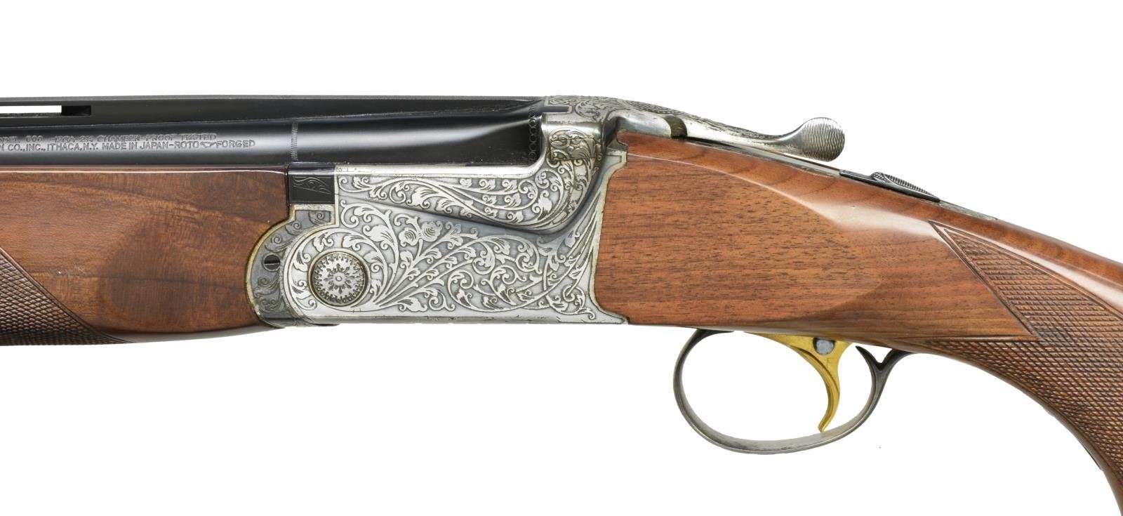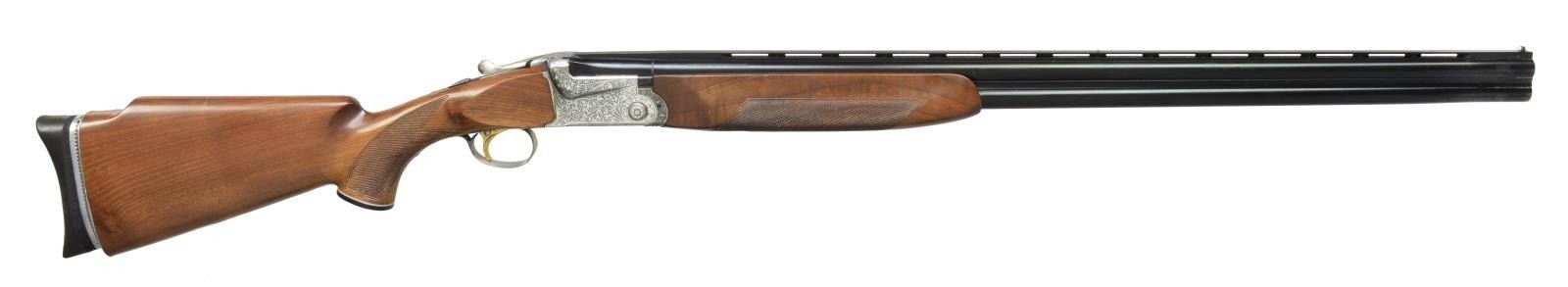 Cal. 12 Ga., 2 3/4". S# S5621919. Bbls. 32" VR w/ fixed Imp. Mod. & Full chokes. Forcing cones are lengthened. White target front sight & steel mid bead. Silver finished boxlock action w/ vine type scroll ornamentation. Features include crossbolt lock, gold finished SST & selective ejectors. Forearm & capped pistol grip Monte Carlo stock of checkered walnut w/ oval name plate in toe line. LOP: 14 5/8" over Morgan adj. pad. UNATTACHED ACCESSORIES: original box. CONDITION: over 95% metal finish. Original wood finish shows a few sm. marks. Action is tight & sound. Bright bores. (20-1575/DS). MODERN. $500-700.
