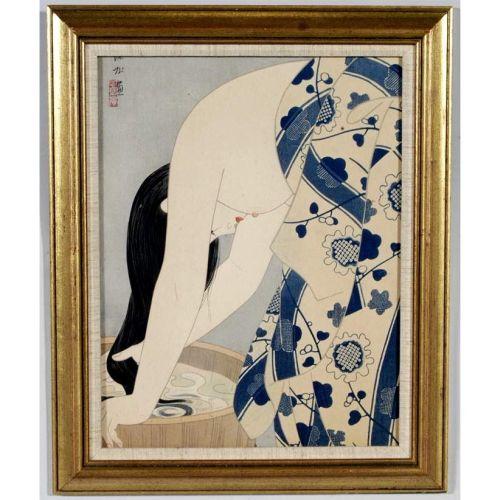 ITO SHINSUI woodblock print 13 1/4"x17 1/4" sight trimmed, 4" tear from top edge with tape behind, circa 1952 CONDITION REPORT: trimmed, toning, wrinkle at top center.