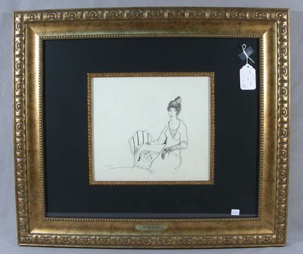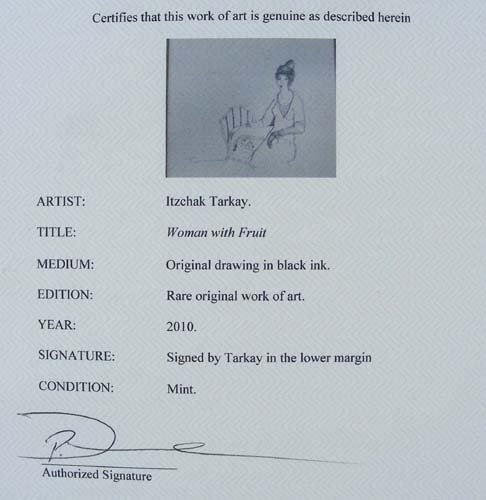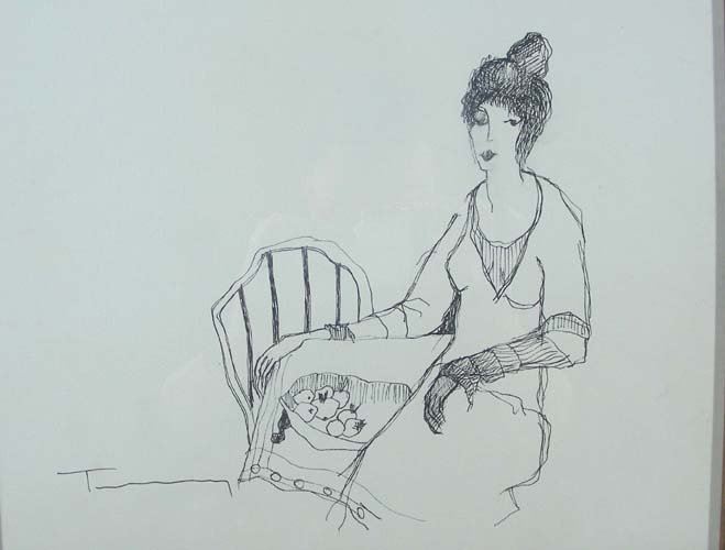 Rare original drawing in black ink "Woman with Fruit". Circa 2010. Hand signed by Tarkay. Professionally framed. Image 11" x 12 1/2", Overall 26" x 29 1/2".
