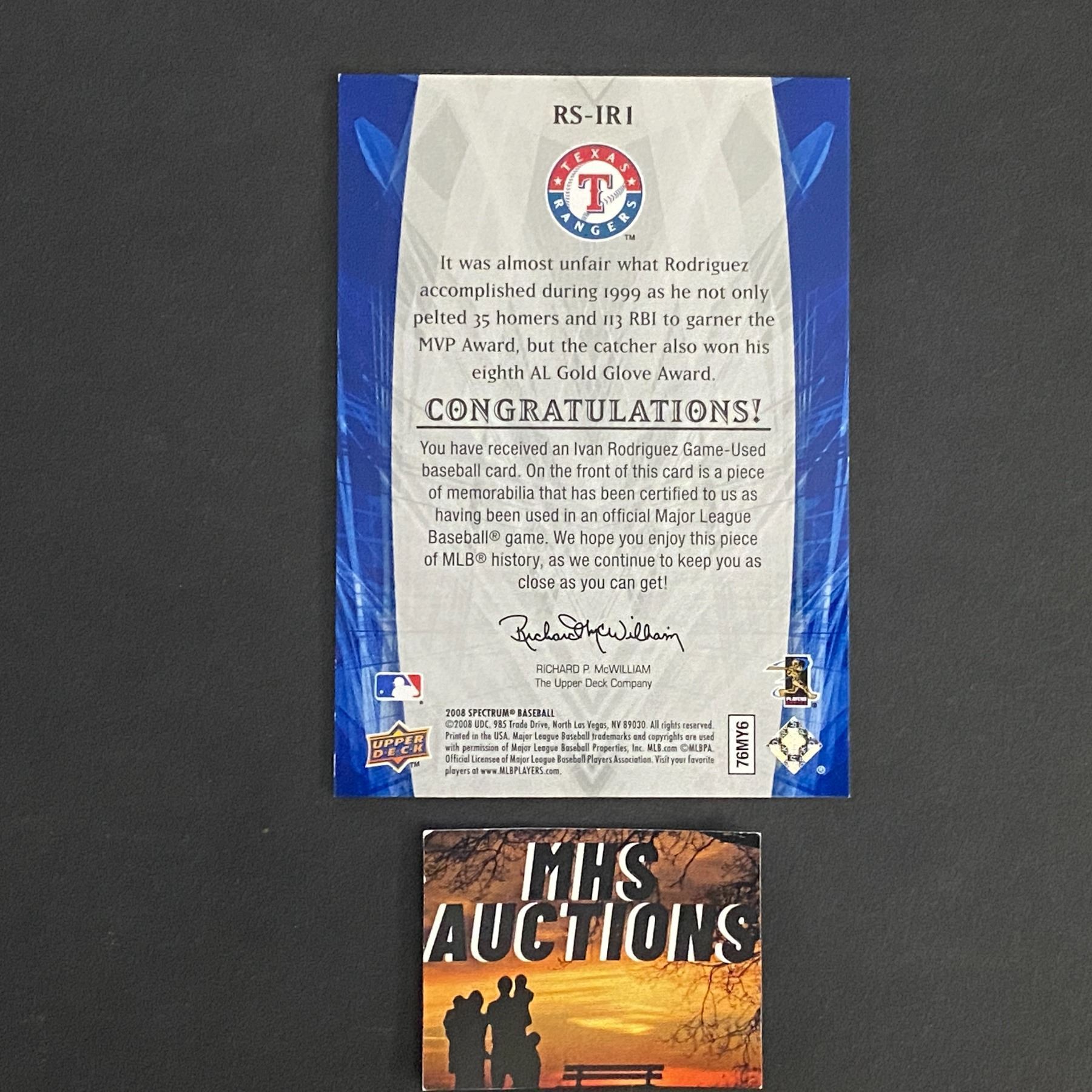 IVAN RODRIGUEZ 2008 SPECTRUM BASEBALL JERSEY CARD