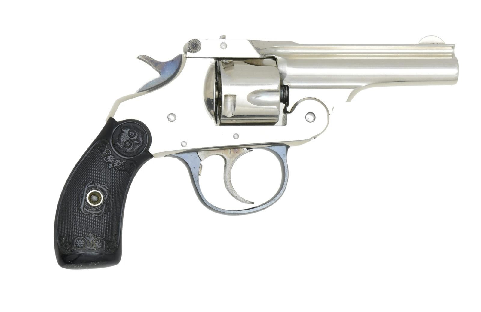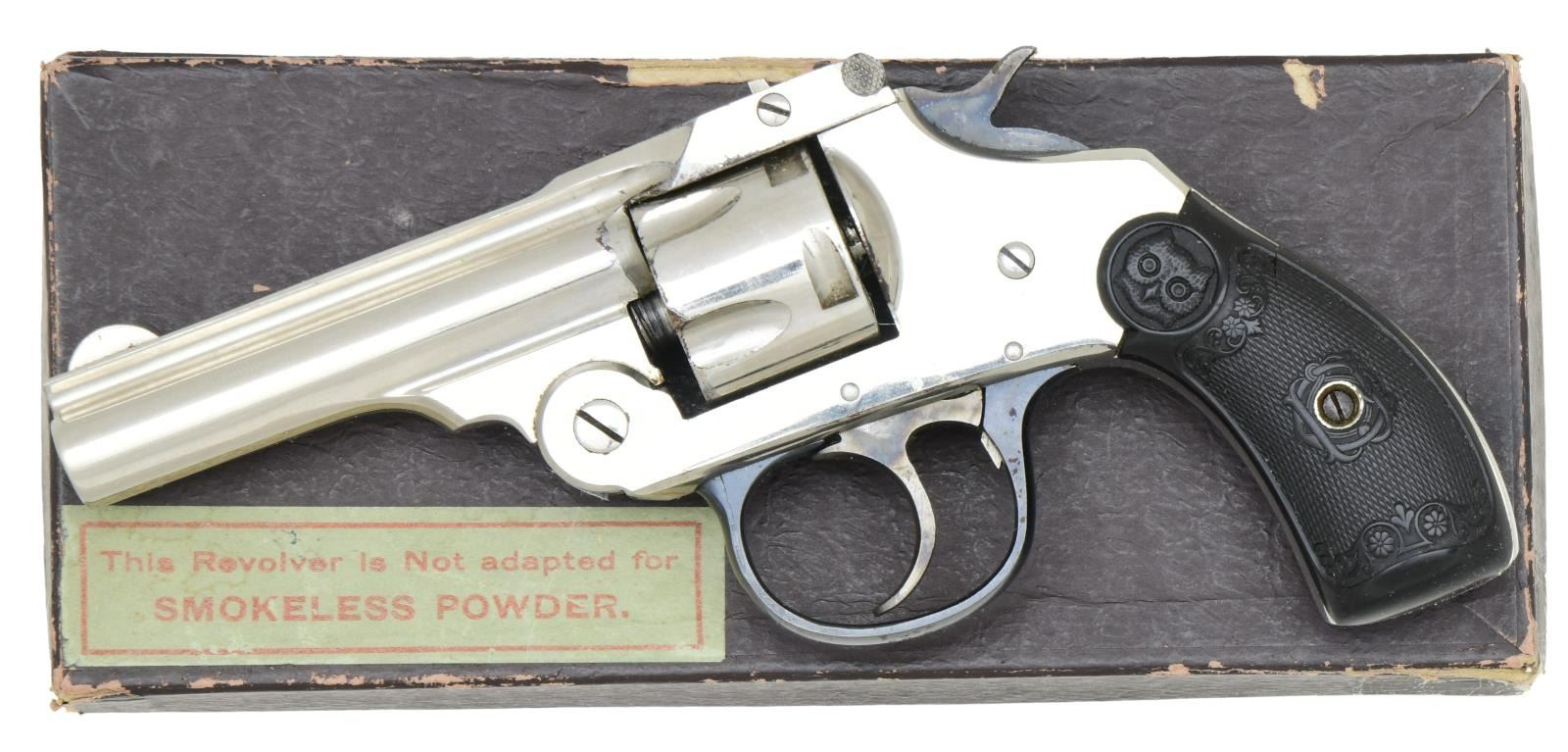 Cal. 32 S&W. S# 50604. Bbl. 3", round with rib and semi-circular sight. Five-shot, fluted cyl. Top-break action. Nickel finish with a blue trigger guard and a case-colored hammer in the trigger. 2-Piece, round, butt-checkered, hard rubber owl's head grips. UNATTACHED ACCESSORIES: original 1-piece box with matching label. Inside the lid are a revolver drawing and instructions. The box shows light tattering with tearing on the end flaps. CONDITION: over 98% original nickel, showing small spots of flaking, small dents, and light scratches. The hammer & trigger have nicely visible case colors. Very good grips. Very good, bright bore. (23-5419/DS). CURIO. $500-700.