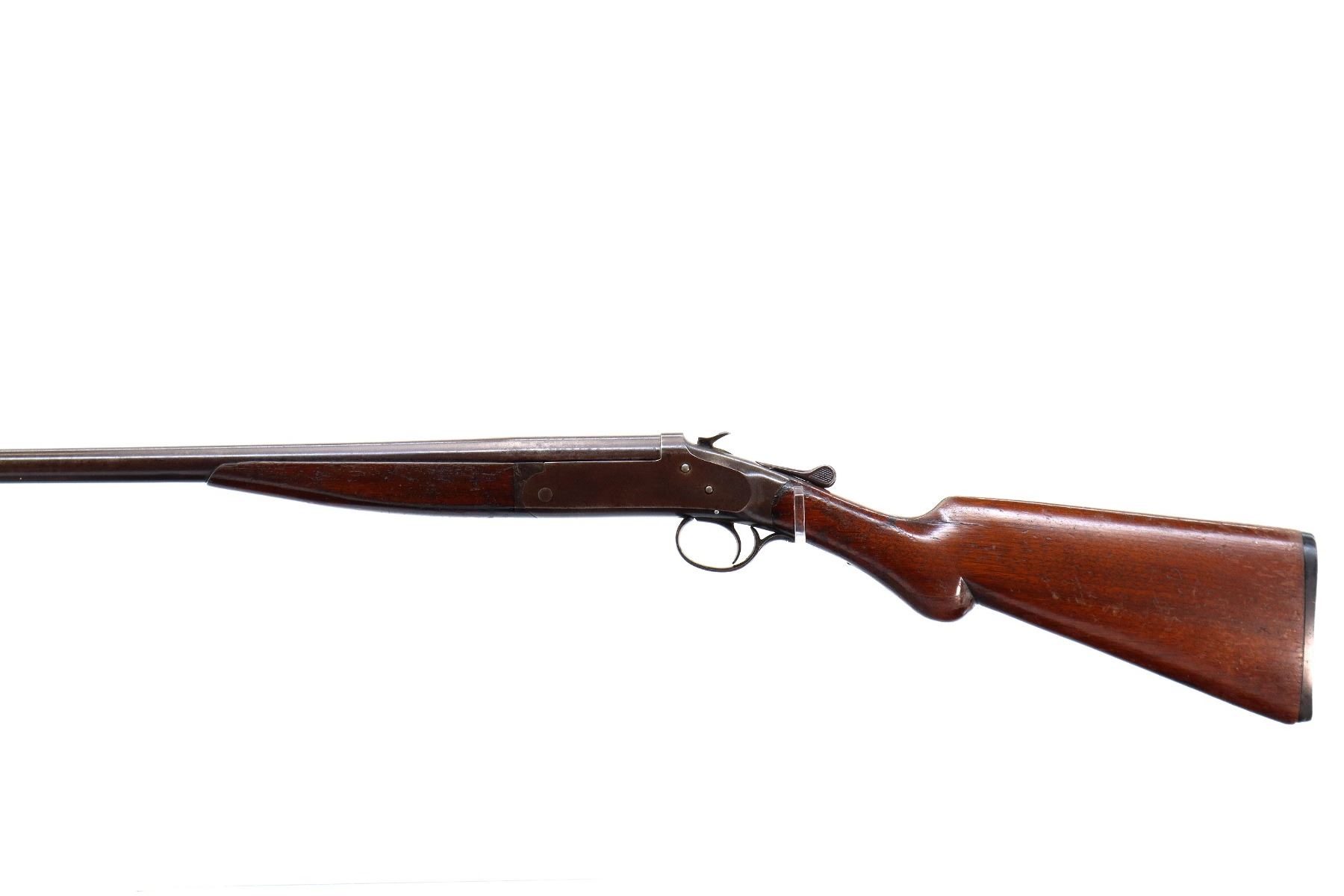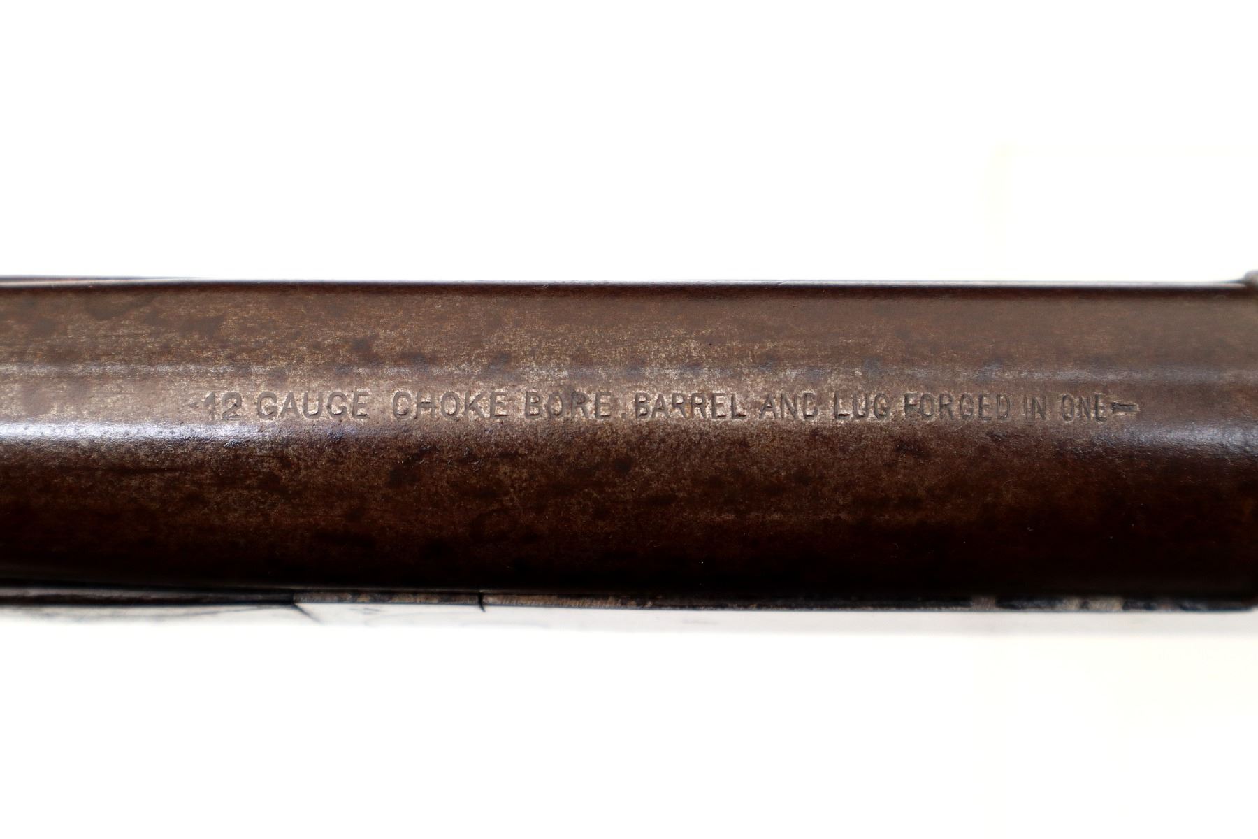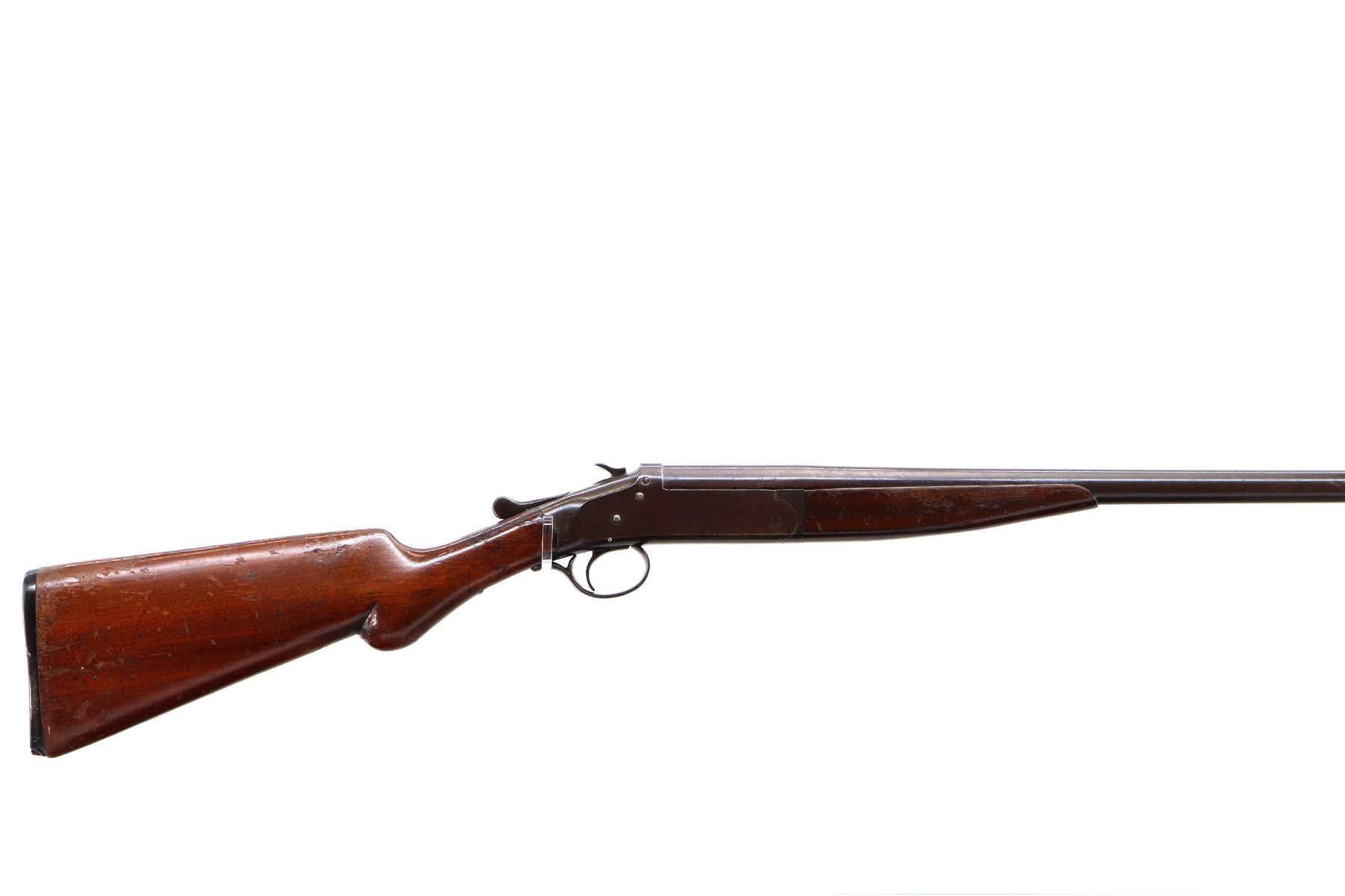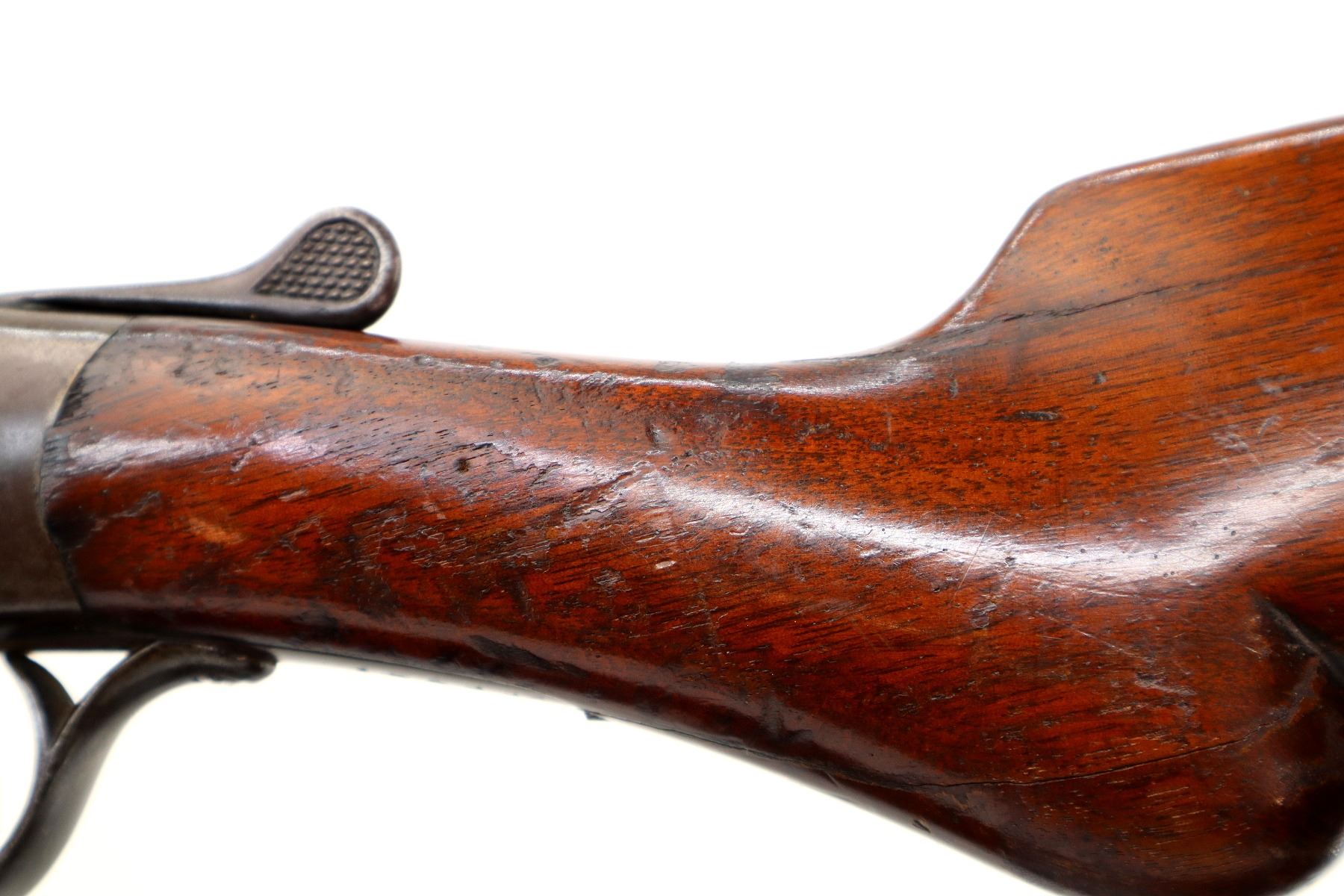 Main Description: White bead, round barrel, checkered spur hammer, extractor. Two piece wood stocks, forend cracked on left side, pistol grip, chipped and cracked behind receiver, upper and lower tangs, Grooved black polymer butt plate chipped at toe.