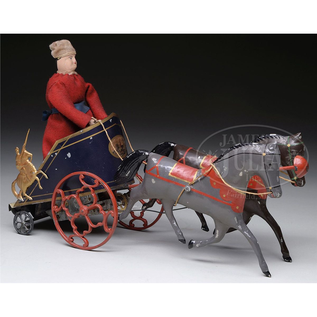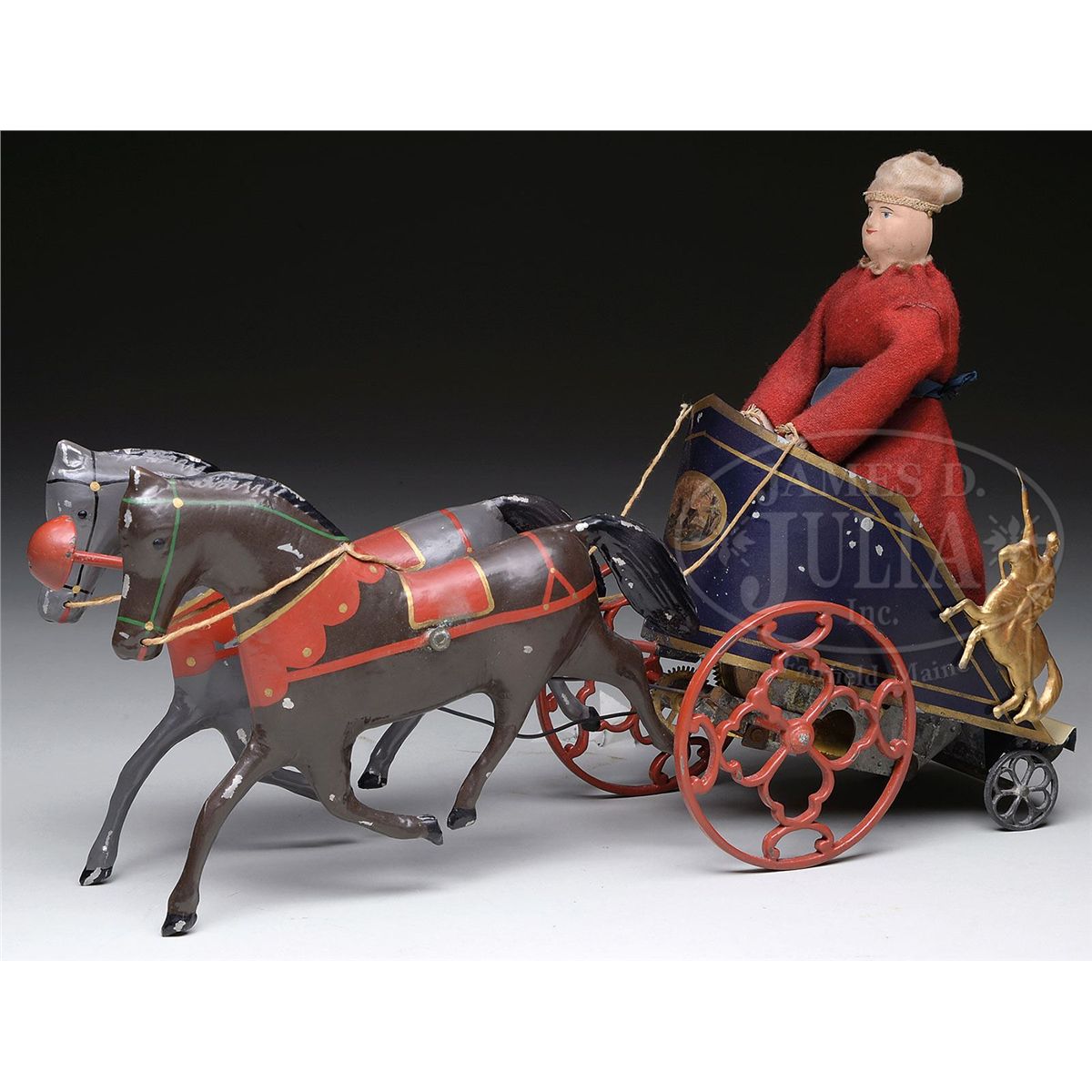 An extremely rare and highly desirable toy, this particular piece was a faithful replica of the original Ives toy, originally manufactured in the later part of the 19th century. Lou Kummerow of northern California created a handful of these in the 1990s, never having seen one, but only by observing and studying pictures. Lou is known for producing miniature furniture and is highly regarded in that particular field. A truly wonderful toy that one could enjoy at a mere fraction of the price of an original if one could even hope to find an original for sale. Recently a market fresh example was sold by this firm for just under $70,000. Included in this lot is an original wooden box, also constructed by Lou Kummerow. SIZE: 15-1/2" l. CONDITION: Overall very fine with appropriate aging to give it the effect of the original time period. 1-13350