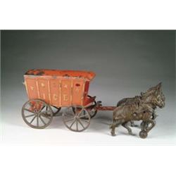 IVES POLAR ICE WAGON. An exceptional toy being pulled by two mules. With a patent date of July 23, 1896, this rare toy is enameled in red with gilt trim and japanned mules. SIZE: 14” l. CONDITION: Overall condition is very good, heavier chipping to roof of ice wagon. Japanning thin on mules, lacking driver. JL 1-4123 (1,500-1,800)