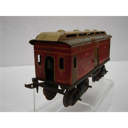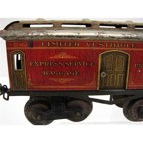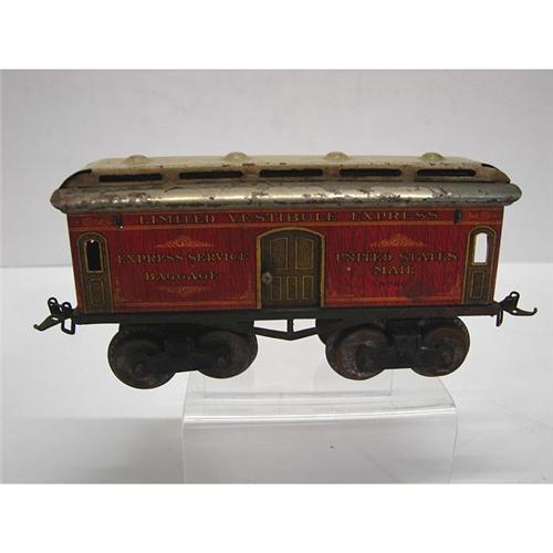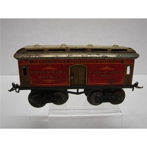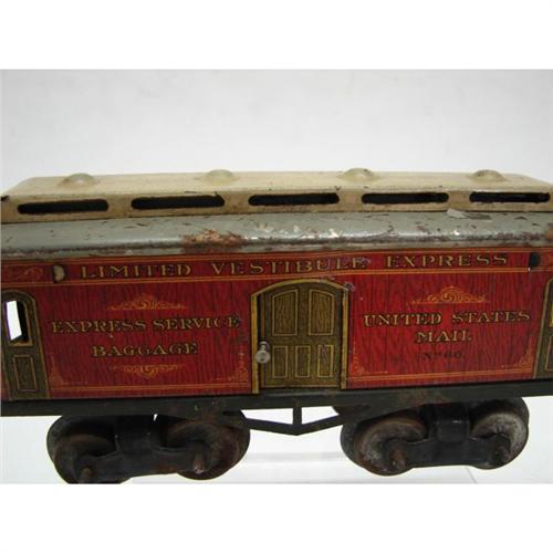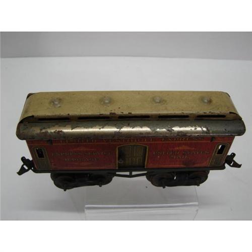 IVES TIN U.S. MAIL BAGGAGE CAR NO. 60. Complete. Minor rusting. Paint loss and flaking to top. About C4. 6.5” long.