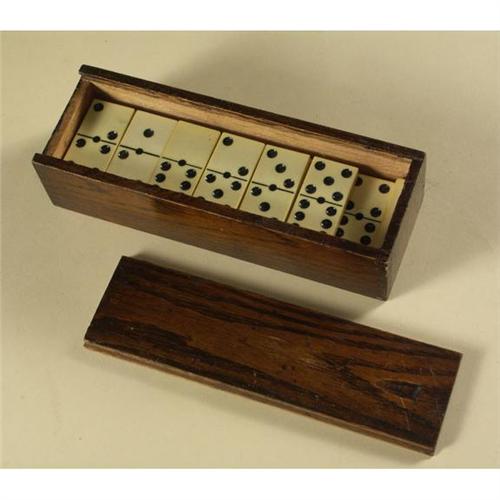 IVOROID DOMINOES: Ivoriod dominoes in wooden box. All 28 pieces included. Box is in good condition with few scratches on the outside.