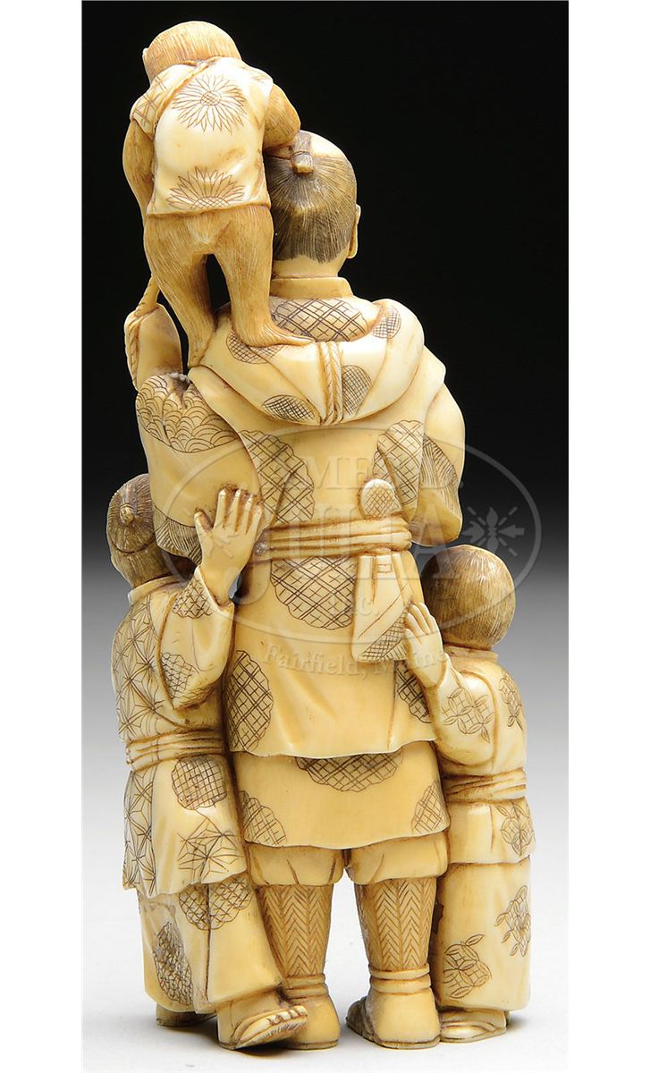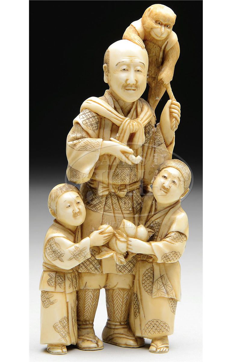 19 century, Japan. Carved ivory of a monkey trainer with monkey and two small children holding peaches. SIZE: 5-3/4" l. CONDITION: Very good. 9-92398