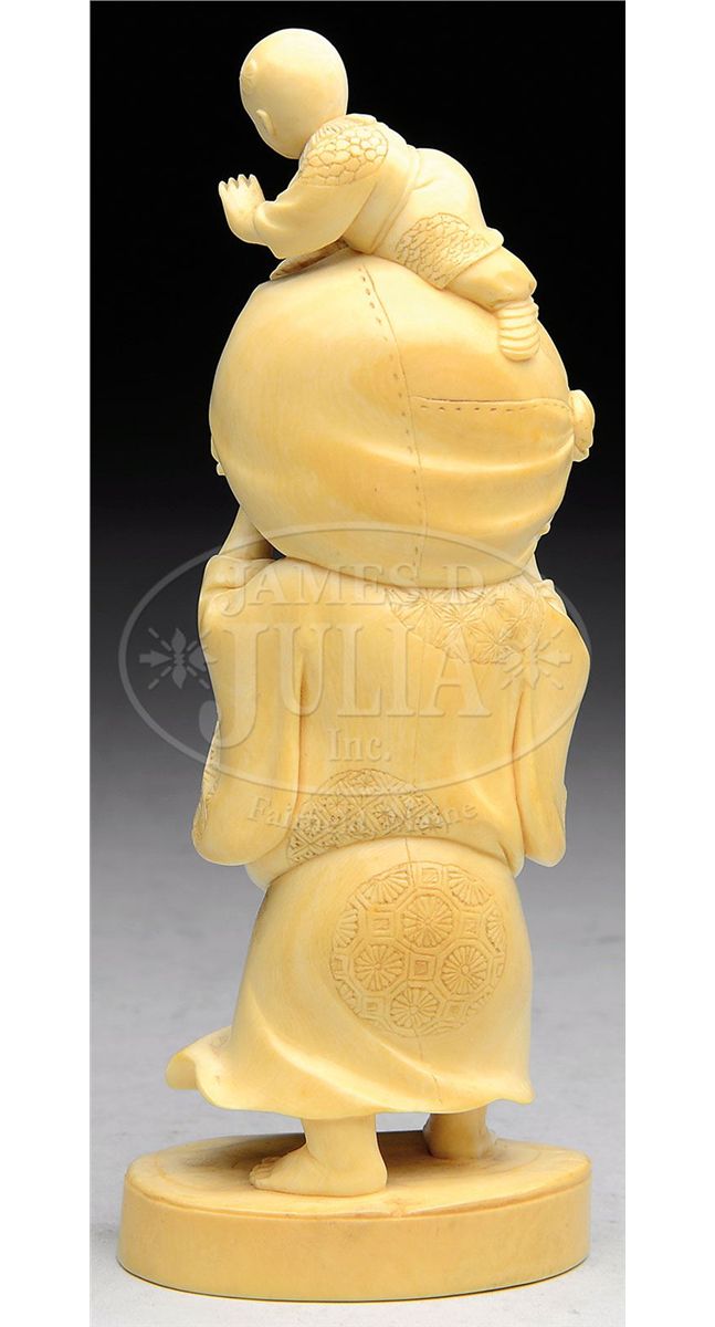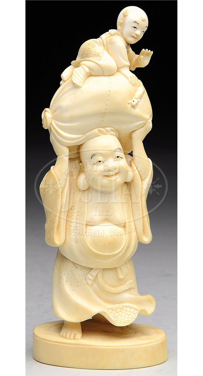 Meiji Period (1868-1912), Japan. Ivory carved figure of Hoi Tei with his bag of wealth and a small child chasing a mouse. Signed. SIZE: 6" t. CONDITION: Very good. 9-92397