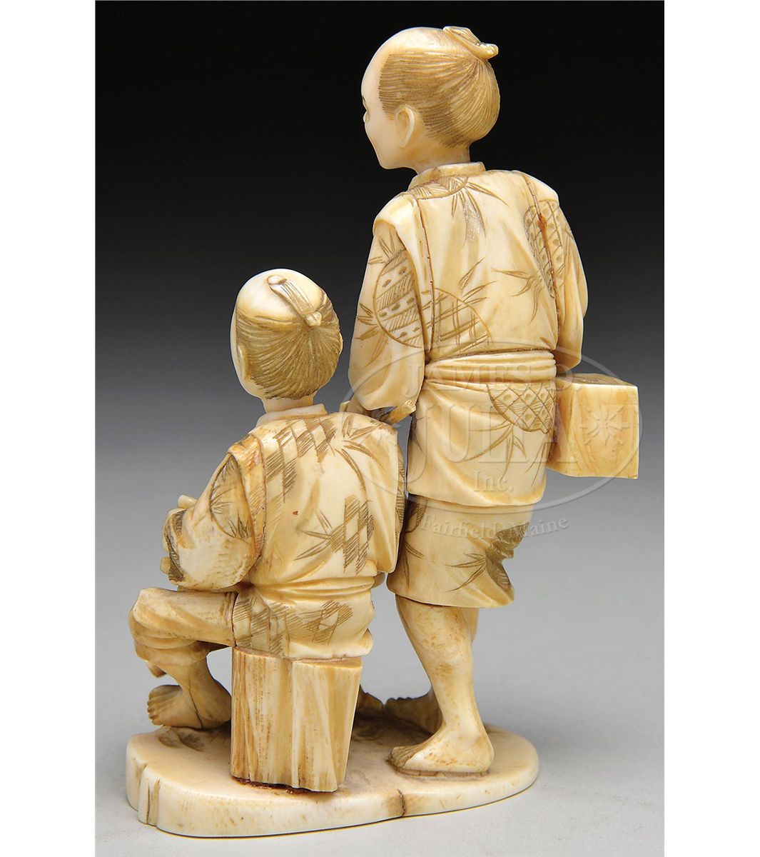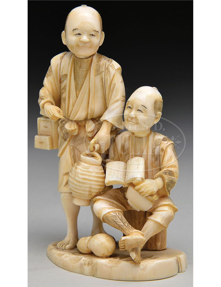 19th century, Japan. Scene of two vendors. Signed on base. SIZE: 5-1/4" h. CONDITION: Very good with minor loss. 9-90872