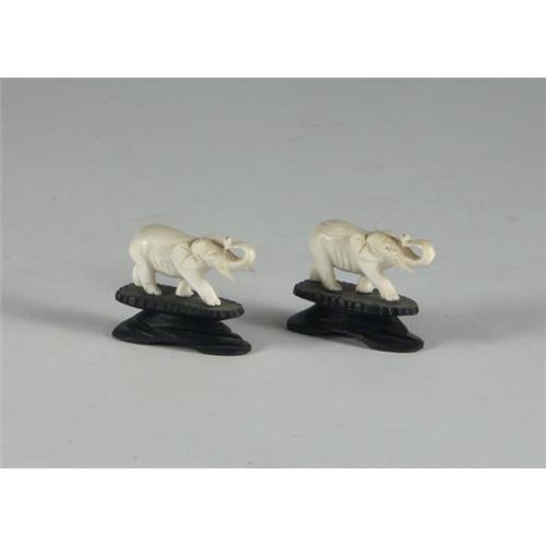 IVORY: A pair of miniature ivory elephant figurines on carved wood stands. Ivory portion measures 1.25'' x 2.5'', some yellowing noted, 20th century.