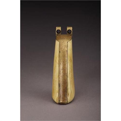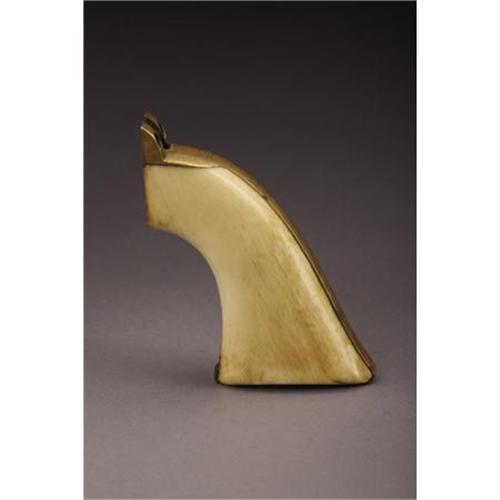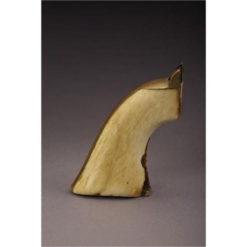 <B>IVORY GRIPS FOR A COLT 1851 NAVY REVOLVER</B></I> - These grips are either of one piece construction or are two piece with an ivory spacer. Interestingly the original 1851 Navy brass backstrap #22258 is with the grips. The grips fit perfectly to the backstrap. A large '45' is stamped on the top flange and the butt of the backstrap. The grips have a wonderful old patina to the ivory. <BR><BR><B>Condition: </B></I>Grips are well worn and very attractive. Right grip has old well aged loss at heel and mid-way up where bend to triggerguard would fit.<BR><BR><b>Shipping:</b> Bats, Clubs, Sticks, Swords, Rif (<a target="_blank" href="http://www.heritageauctions.com/common/shipping.php">view shipping information</a>)