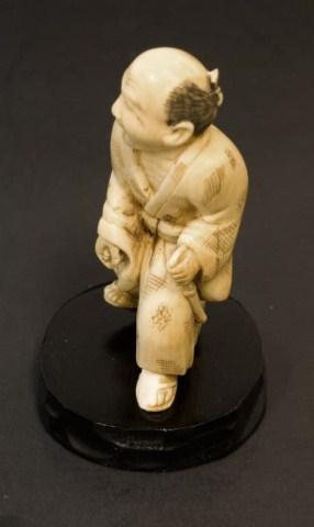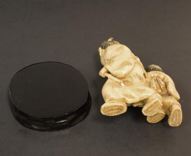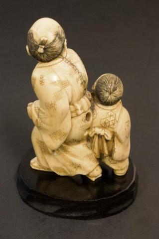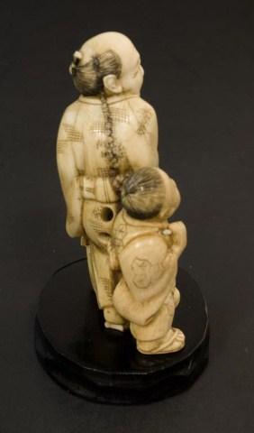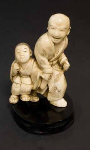 Depicts a man and child taking a walk with walking sticks. Netsuke holes to back. No apparent signature. Includes wooden stand. Measureas 2 3/4" h X 1 5/8" w.
