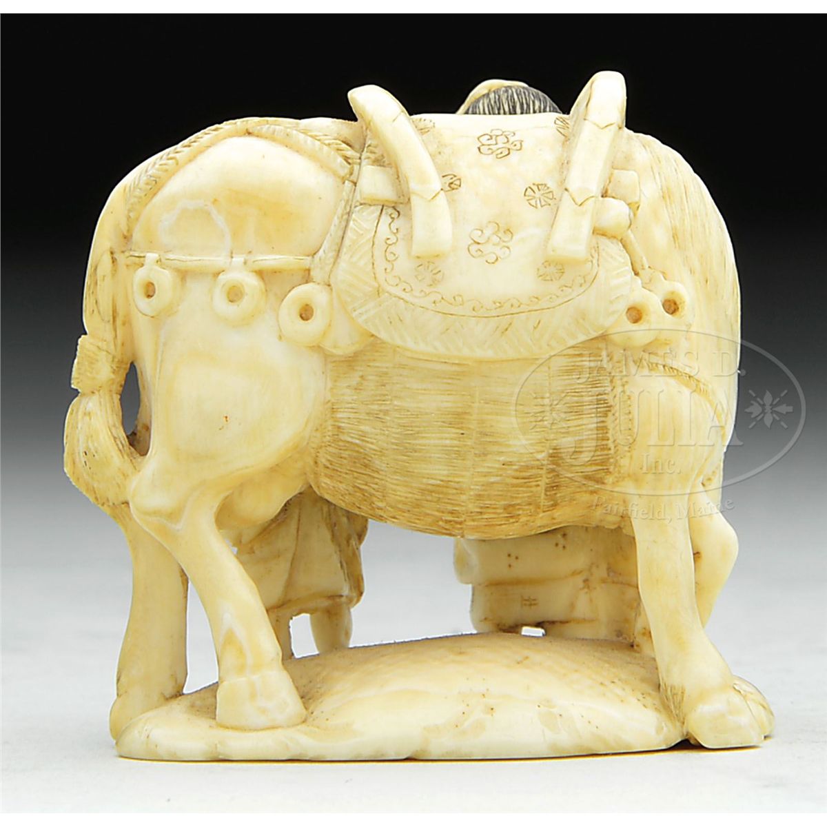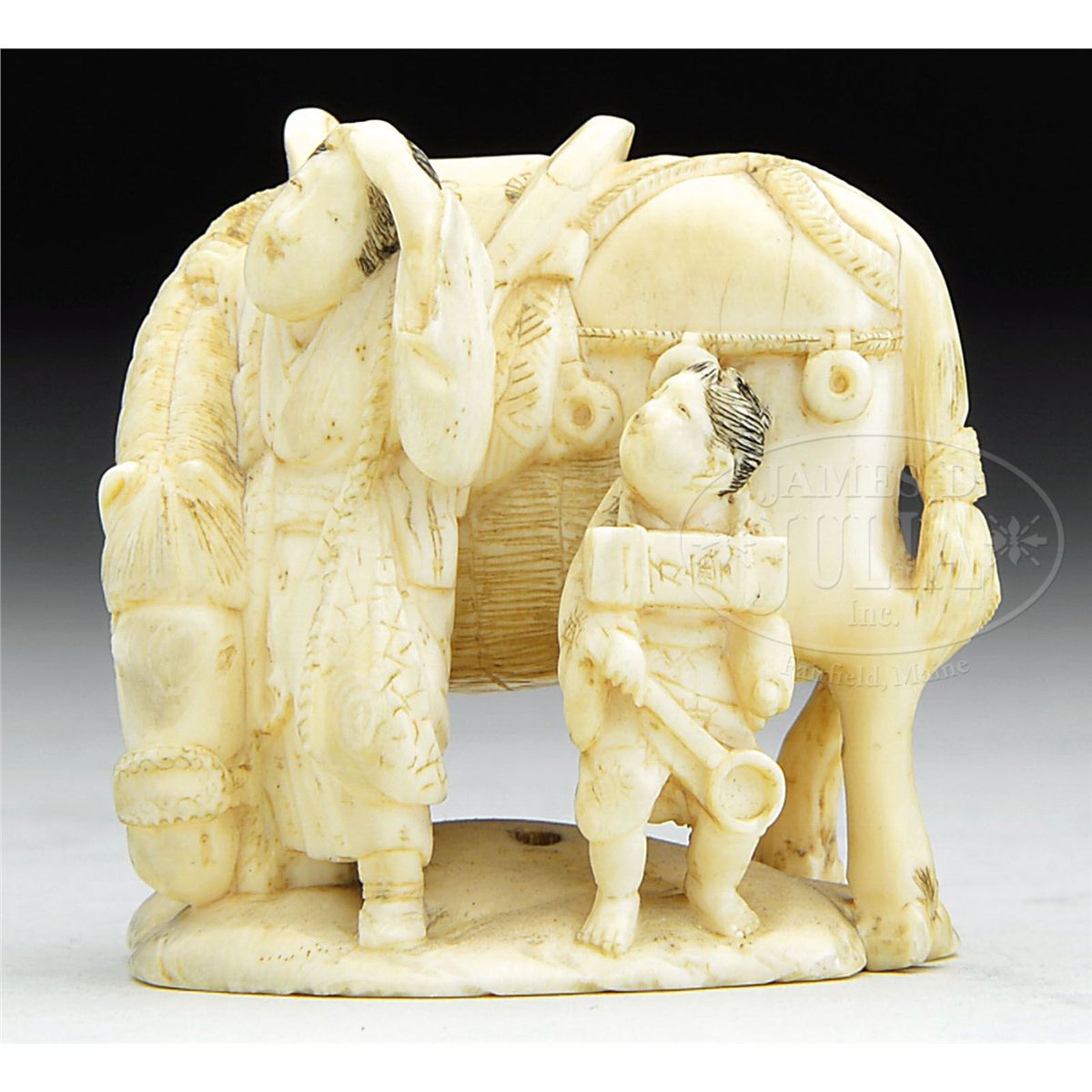 19th century, Japan. 2 figures and a horse. Signed Chokosai. SIZE: 1-1/2" t x 1-1/2" w. CONDITION: Very good. 7-74560