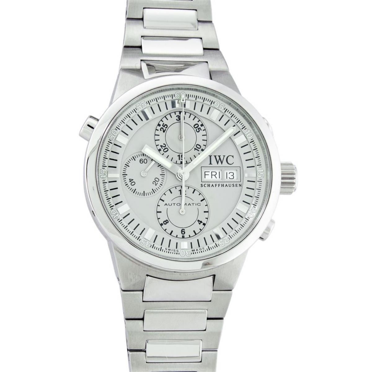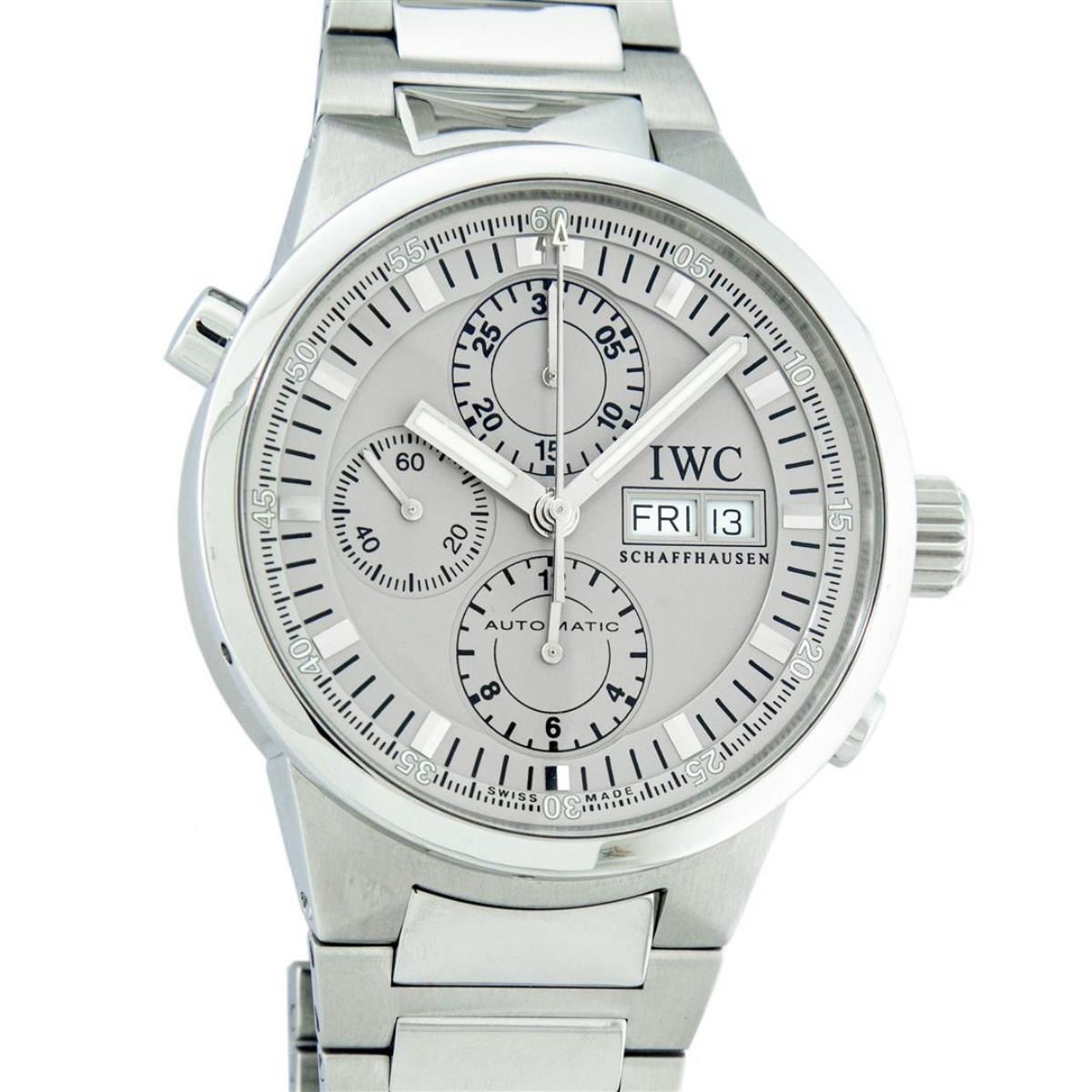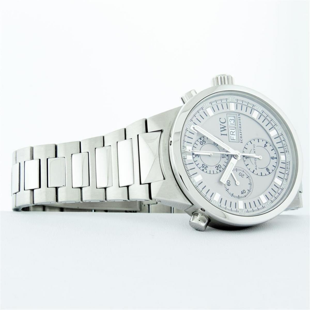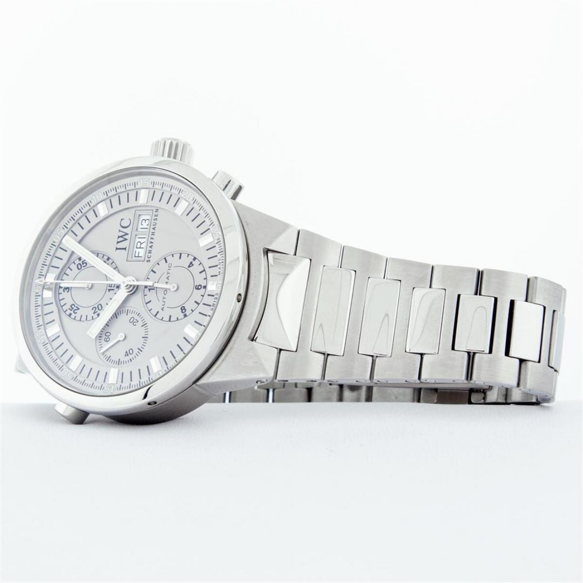One Mens IWC Stainless Steel GST Rattrapante Split Second Chronograph Polished bright with Satin Finish, This Watch Has Been Serviced & Electronically Tested, Stainless Steel Case: 43mm, Stainless Steel Crown. Bezel: Stainless Steel Smooth Bezel, Crystal: Sapphire Crystal. Hands: IWC Silver Baton Markers, Movement: Handmade Swiss Automatic Movement. 3 Sub Dials: 60 Second, 30 Minute and 12 Hour Dial: IWC Grey Dial, Window: 3 O'Clock Position Date Display, Functions: Chronograph, Rattrapante, Date, Day, Hour, Minute, Small Second. Model : GST Split Second Chronograph Rattrapante. Condition: G-6 Extra Fine. Bracelet: Stainless Steel IWC GST Bracelet, Bright Polish & Satin Finish. 8.0 Inch Length, Adjustable. Stainless Steel IWC Deployant Clasp. This Watch Has Been Serviced Time Tested And Is In Excellent Condition, It Is Free Of All Scratches And Dents (Small Scratch On Original Crystal)