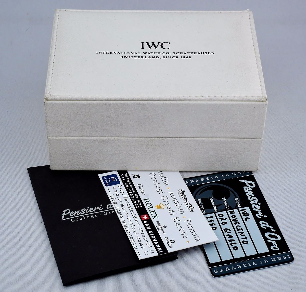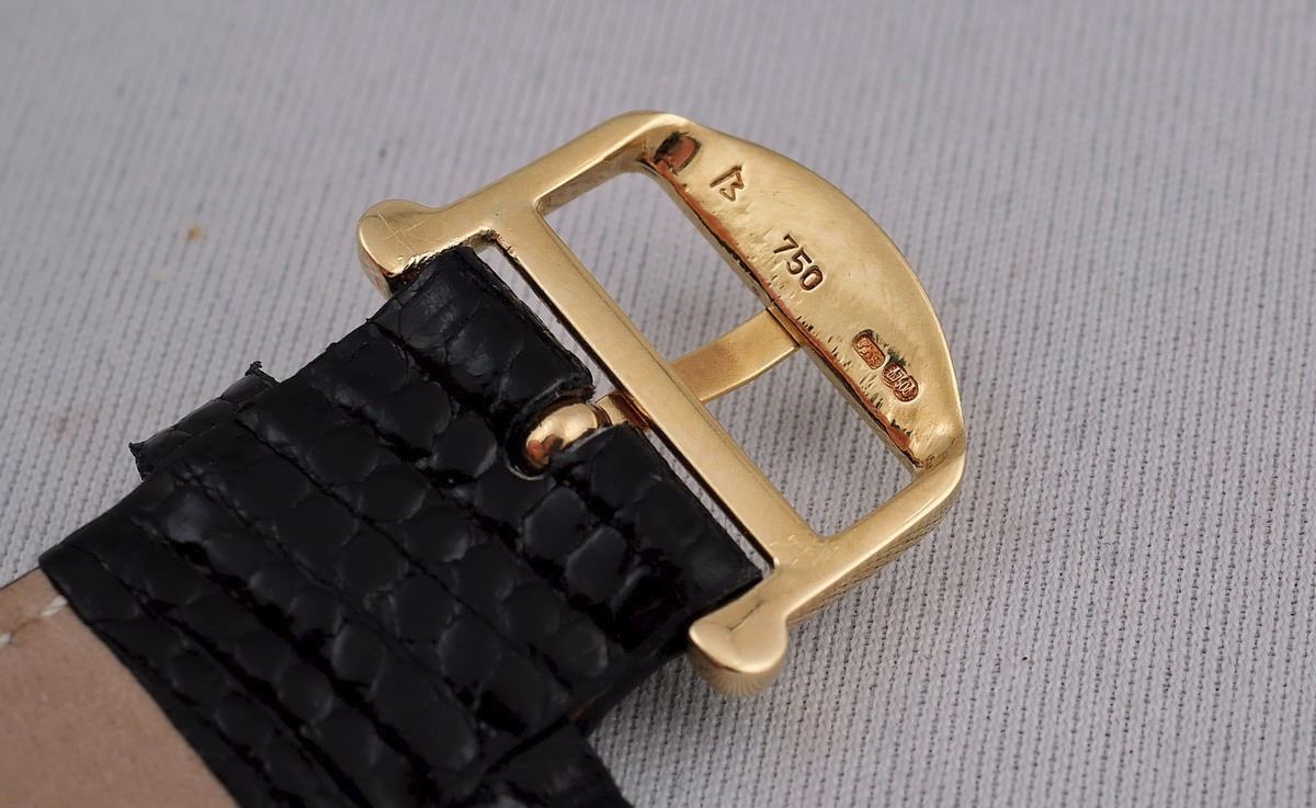 brand-new Alpine 19 mm black lizard leather band; original signed IWC 18k solid-gold buckle; total length of the watch with band and buckle 9 1/4"" (23.5 cm).