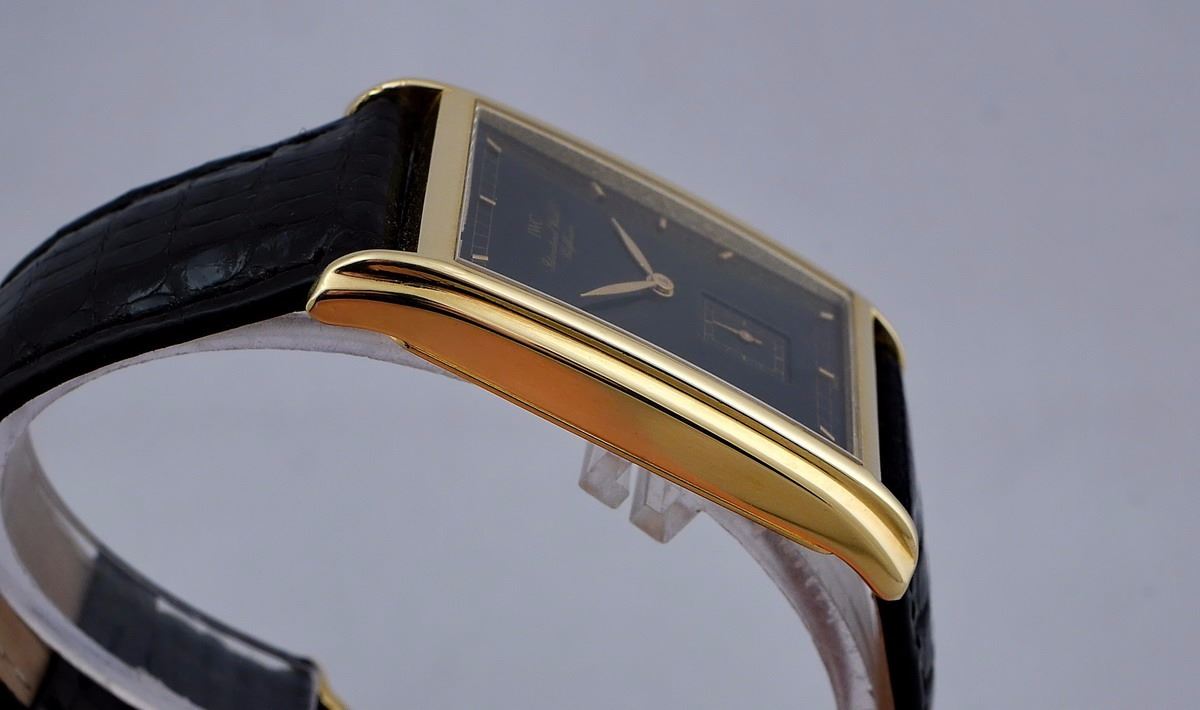 The watch sports a classic-looking black-color dial with original ""Swallow"" hands, rectangular second's sub-dial, applied gold hour markings and ""rail"" minute track.