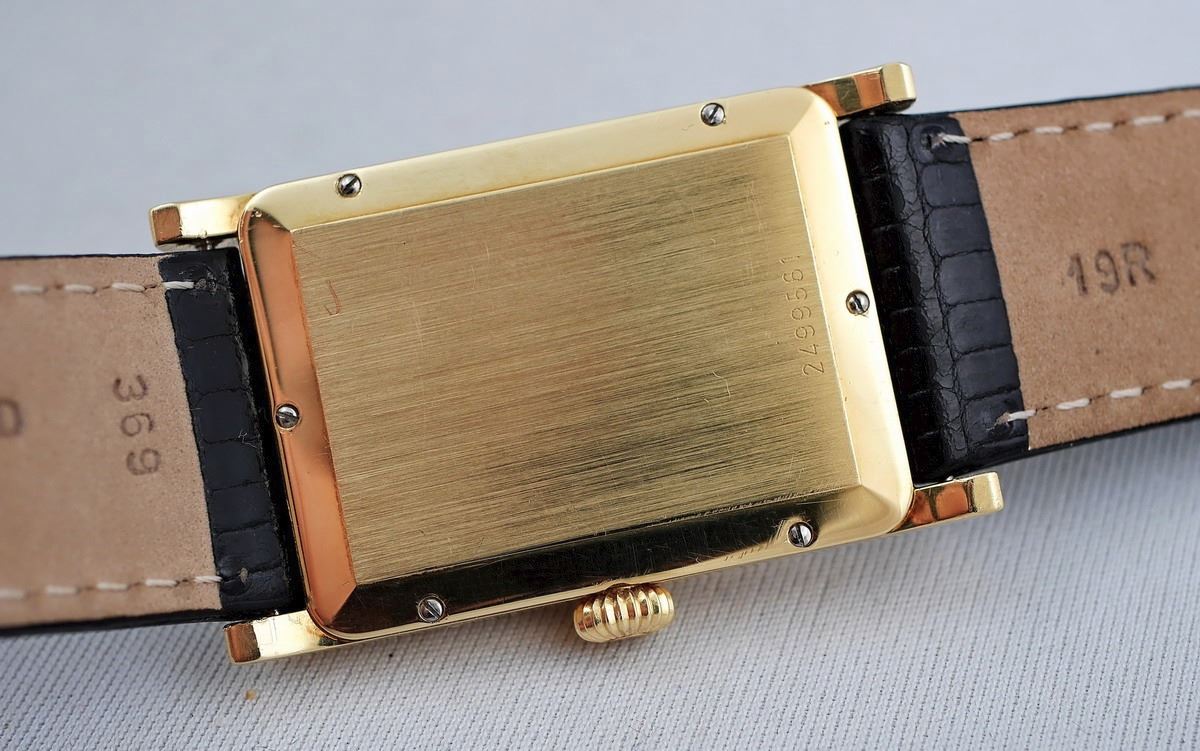 The 18k solid-gold case is thick and heavy and closes tightly and precisely, secured by six screws on back. The original solid yellow-gold winding crown has a nice vintage-style shape. The original sapphire crystal is clean and free of scratches. This highly collectible timepiece would be an excellent financial investment, always raising its value.