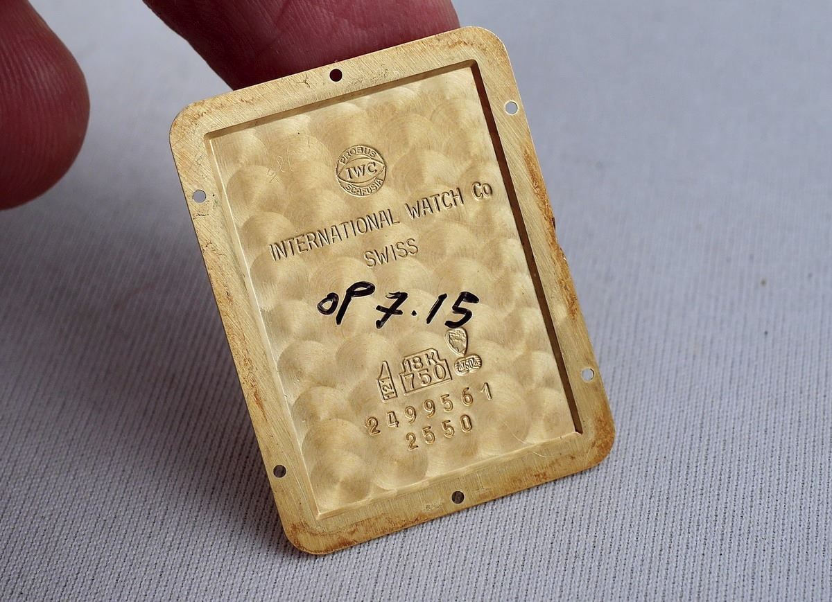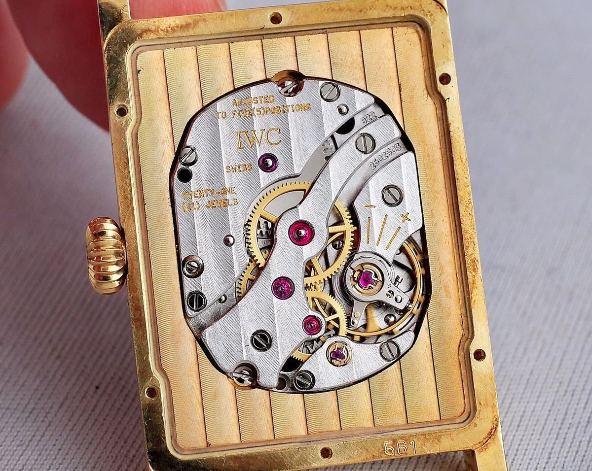 genuine Swiss Made manual-wind 17 jewels International Watch Co. 822 caliber (based on Jaeger-LeCoultre Cal. 822), 21 jewels, 2.94mm thin; 45 hour power reserve; 21,600 A/h, 7¾ x 10 lignes, 22.6 x 17.2 mm, indirect seconds; adjusted and tested in 5 positions; signed and numbered; excellent working and keeping time;