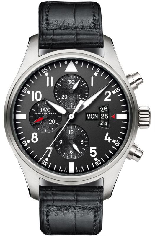 Model: IW377701 - CASE = [Material:Brushed Stainless Steel], [Case Diameter:43], [Case Thickness:15mm], [Bezel:Fixed], [Case Back:Solid], [Water Resistant:60 Meters / 200 Feet], [Crystal:Scratch Resistant Sapphire], DIAL = [Color:Black Chronograph with Day/Date at 3], MOVEMENT = [Type:Automatic Self Winding], [Crown:Screw Down], BAND = [Clasp:Tang Buckle], [Type:Black Crocodile Leather], (Usually ships in 1 to 2 weeks.)