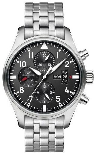 Model: IW377704 - CASE = [Material:Brushed Stainless Steel], [Case Diameter:43], [Case Thickness:15mm], [Bezel:Fixed], [Case Back:Solid], [Water Resistant:60 Meters / 200 Feet], [Crystal:Scratch Resistant Sapphire], DIAL = [Color:Black Chronograph with Day/Date at 3], MOVEMENT = [Type:Automatic Self Winding], [Crown:Screw Down], BAND = [Clasp:Deployment Buckle], [Type:Brushed Stainless Steel], (Usually ships in 1 to 2 weeks.)