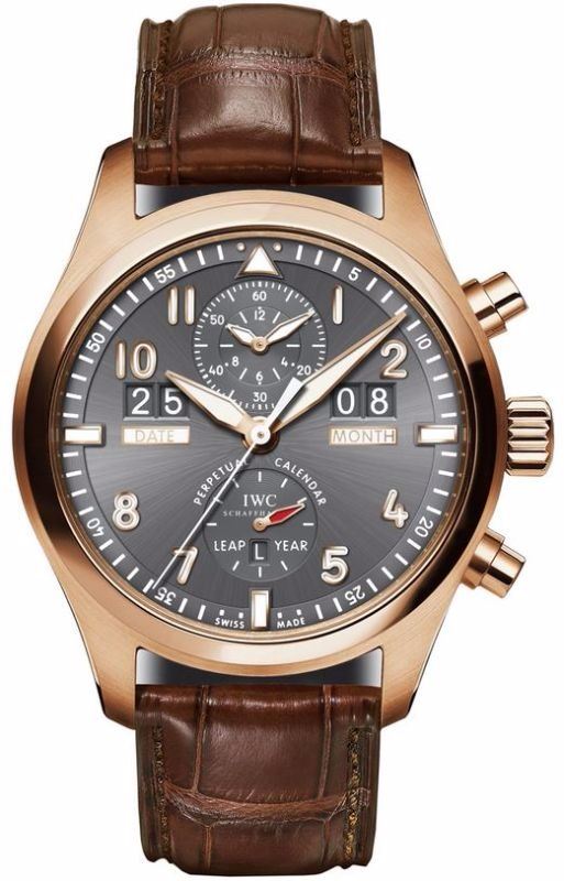 Model: IW379103 - CASE = [Material:18kt Rose Gold], [Case Diameter:46], [Case Thickness:17.5mm], [Bezel:Fixed], [Case Back:Skeleton], [Water Resistant:60 Meters - 195 Feet], [Crystal:Scratch Resistant Sapphire],; DIAL = [Color:Grey],; MOVEMENT = [Type:Automatic Chronograph], [Crown:Screw Down],; BAND = [Clasp:Tang], [Type:Brown Alligator Leather], (Usually ships in 1 to 2 weeks.)