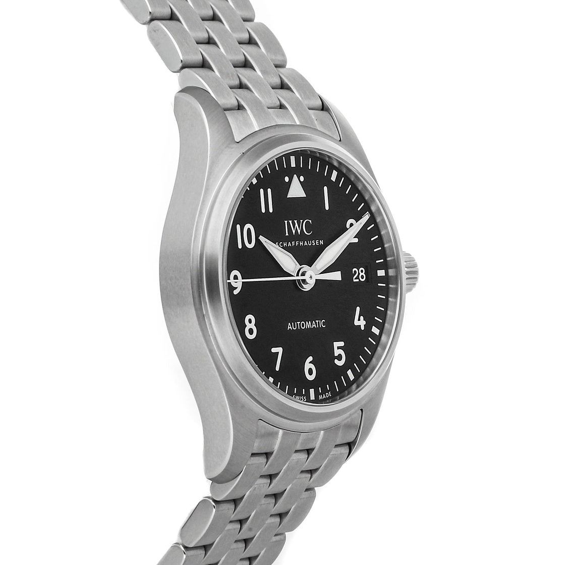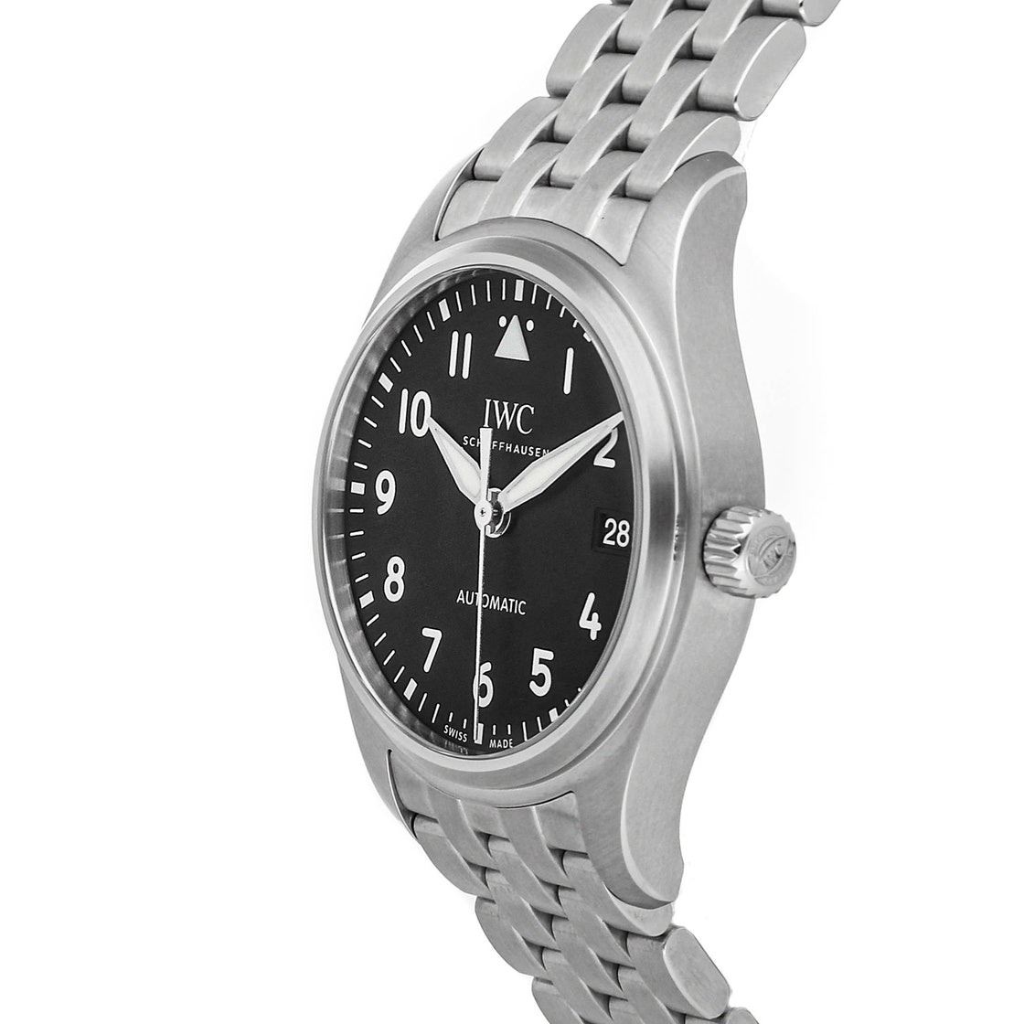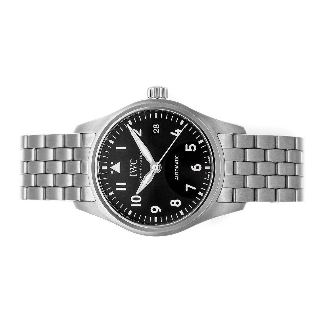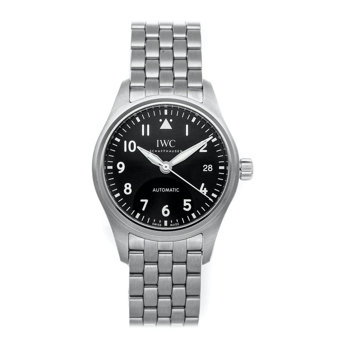 IWC Pilot's Watch (IW324010) self-winding automatic watch, features a 36mm stainless steel case surrounding a black dial on a stainless steel bracelet with folding buckle.