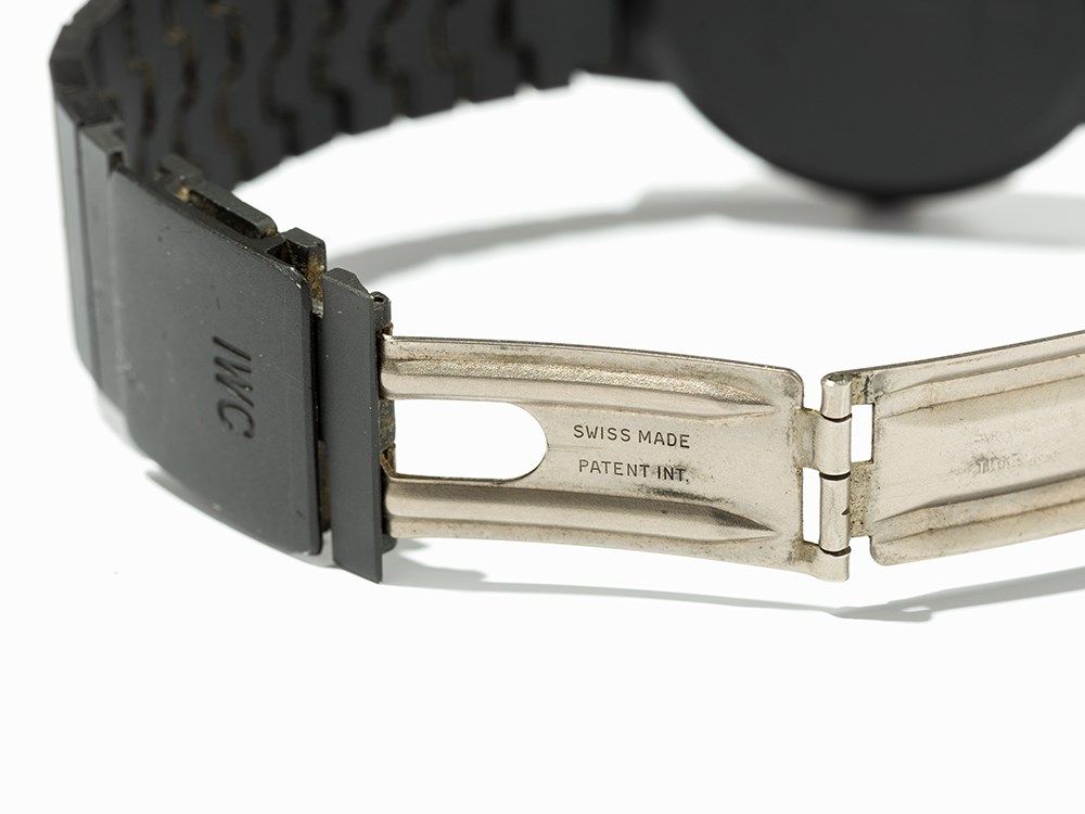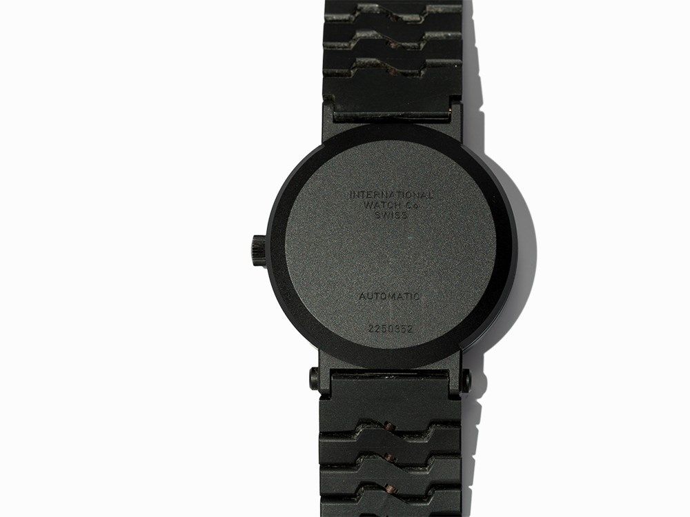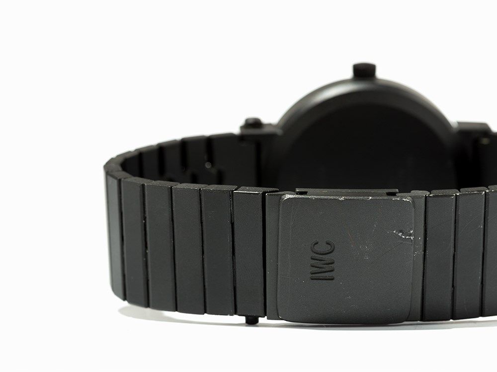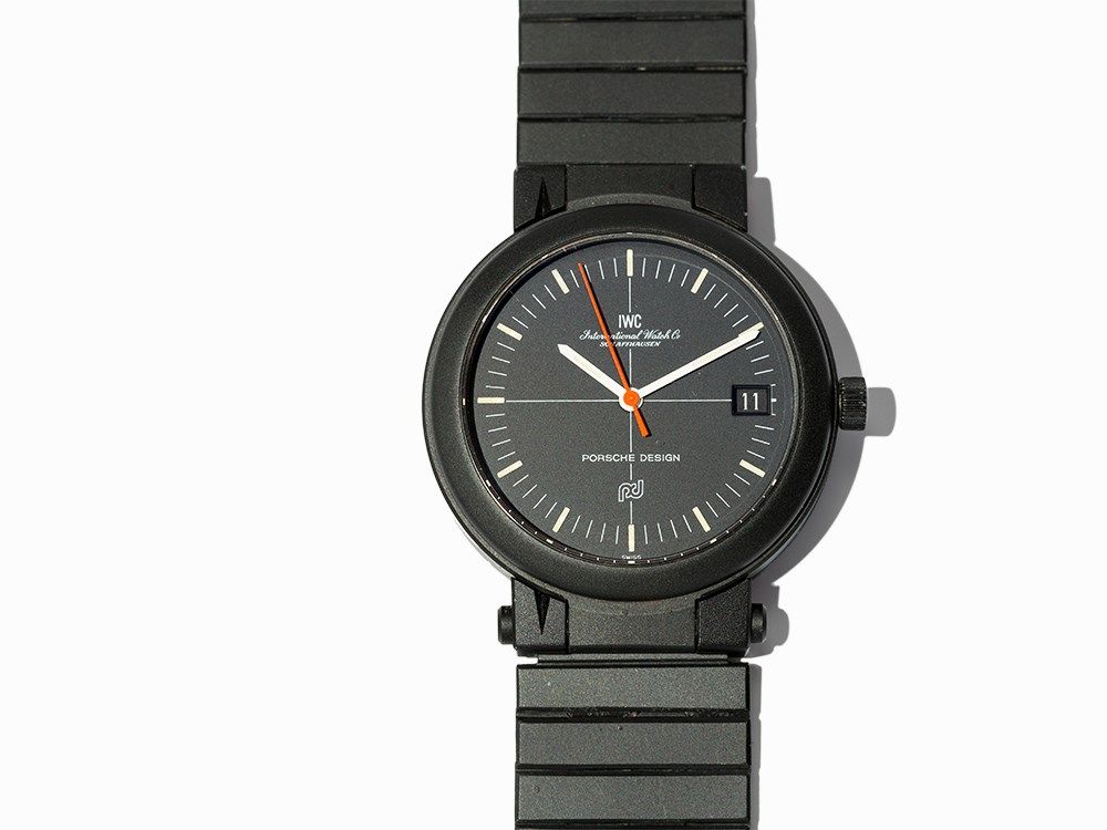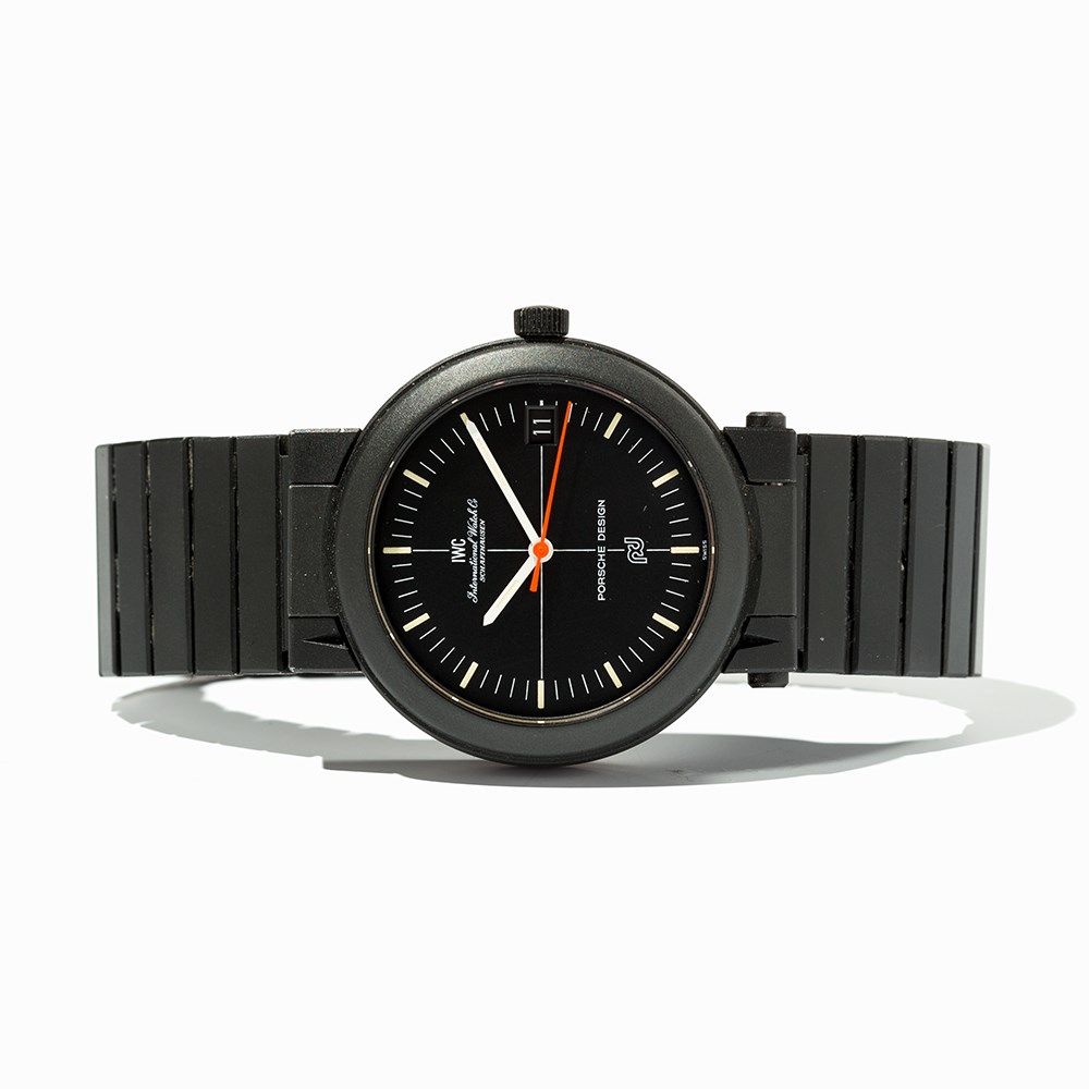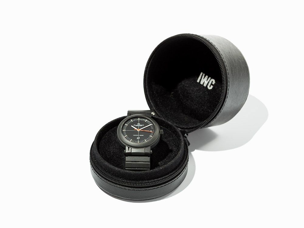The present IWC Porsche Design compass watch was manufactured in Switzerland in 1980. It has an automatic movement and displays the hour, minute, second and date. The black dial is fitted with indices as well as white and red hands. The round watchcase is made of blackened aluminum, and the strap is manufactured from blackened titanium.