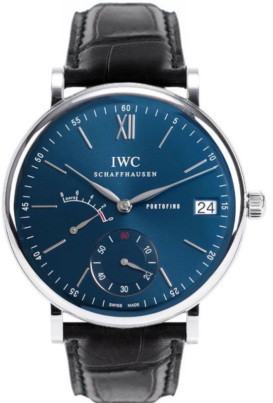 Model: IW510106 - CASE = [Material:Stainless Steel], [Case Diameter:45], [Case Thickness:12mm], [Bezel:Fixed], [Case Back:Skeleton], [Water Resistant:30 Meters - 100 Feet], [Crystal:Scratch Resistant Sapphire], DIAL = [Color:Blue], MOVEMENT = [Type:Automatic Self Winding 8-Day Power Reserve], [Crown:Push Down], BAND = [Clasp:Tang], [Type:Black Alligator Leather], (Usually ships in 1 to 2 business days.)