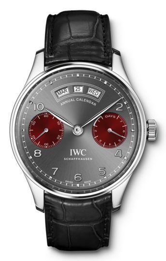 Model: IW503506 - CASE = [Material:Stainless Steel], [Case Diameter:44.2], [Bezel:Fixed], [Case Back:Skeleton], [Water Resistant:30 Meters - 100 Feet], [Crystal:Scratch Resistant Sapphire], DIAL = [Color:Grey with Red Subdials], MOVEMENT = [Type:Self Winding Automatic, 7 Day Power Reserve, Annual Calendar], [Crown:Push In], BAND = [Clasp:Tang], [Type:Black Alligator Leather], (Usually ships in 1 to 2 weeks.)