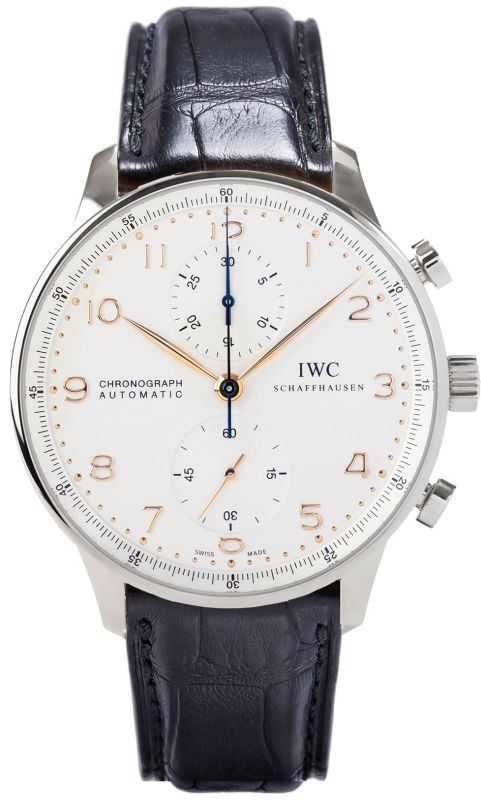 Model: IW371445 - CASE = [Material:Stainless Steel], [Case Diameter:41], [Case Thickness:12.5mm], [Bezel:Fixed], [Case Back:Solid], [Water Resistant:30 Meters / 100 Feet], [Crystal:Scratch Resistant Sapphire], DIAL = [Color:Silver Chronograph with Gold Numbers and Hands], MOVEMENT = [Type:Automatic Self Winding], BAND = [Clasp:Deployment Buckle], [Type:Black Crocodile Leather], (Usually ships in 1 to 2 business days.)