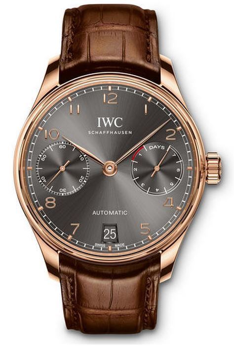 Model: IW500702 - CASE = [Material:18kt Rose Gold], [Case Diameter:42.3], [Case Thickness:14.5mm], [Bezel:Fixed], [Case Back:Skeleton], [Water Resistant:30 Meters - 100 Feet], [Crystal:Scratch Resistant Sapphire], DIAL = [Color:Grey], MOVEMENT = [Type:Pellaton Automatic Winding 7-Day Power Reserve], [Crown:Screw Down], BAND = [Clasp:Tang], [Type:Brown Alligator Leather], (Usually ships in 1 to 2 weeks.)