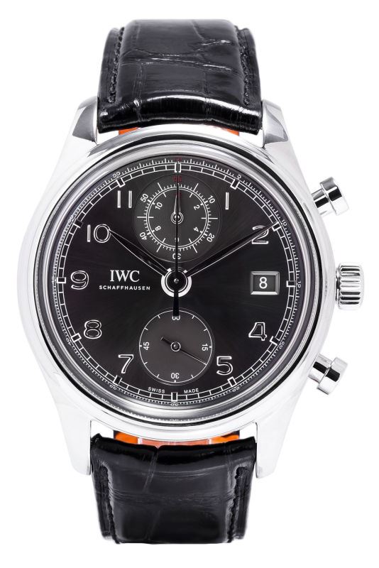 Model: IW390404 - CASE = [Material:Brushed and Polished Stainless Steel], [Case Diameter:42], [Case Thickness:14.5mm], [Bezel:Fixed], [Case Back:See-thru Sapphire Crystal], [Water Resistant:30 Meters - 100 Feet], [Crystal:Scratch Resistant Sapphire], DIAL = [Color:Grey/Ardoise Chronograph with Date at 3, Seconds at 6, Chronograph Hour and Minute Totalizer at 12], MOVEMENT = [Type:Automatic Self Winding Calibre 89361 with 68Hr. Power Reserve], BAND = [Clasp:Tang Buckle], [Type:Black Alligator 'Santoni' Leather], (Usually ships in 1 to 2 weeks.)