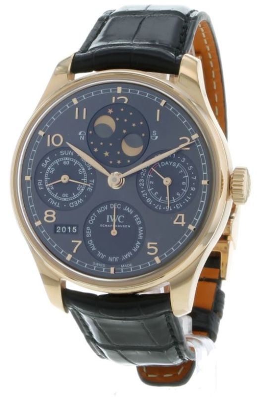 Model: IW503404 - CASE = [Material:18kt Rose Gold], [Case Diameter:44.2], [Case Thickness:15.3mm], [Bezel:Fixed], [Case Back:Skeleton], [Water Resistant:30 Meters - 100 Feet], [Crystal:Scratch Resistant Sapphire], DIAL = [Color:Grey], MOVEMENT = [Type:Pellaton Automatic Winding 7-Day Power Reserve], [Crown:Screw Down], BAND = [Clasp:Tang], [Type:Black Alligator Leather], (In Stock - Ready to ship.)