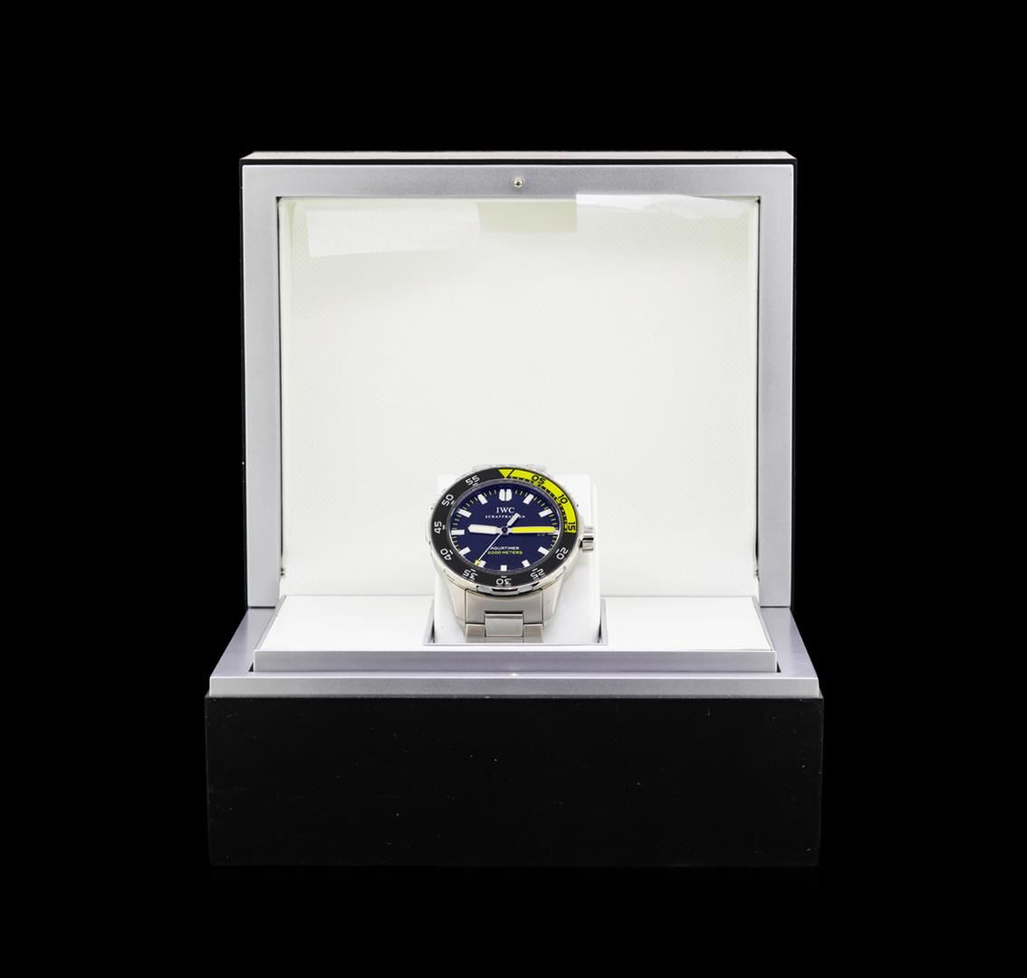 One, stainless steel IWC Aquatimer wristwatch electronically tested, Case: 44mm, Water Resistant: 2000 meters / 6500 feet, Case Back: engraved with the manufacturers name, model, and ID numbers, Logo'd Crown, Bezel: uni-directional sixty minute timer, with luminous numerals, Crystal: synthetic sapphire lens, Movement: automatic. Power Reserve: 42 hours. IWC signed Dial: Black, with luminous indices and a Yellow ringed minute track, Stop Function: second hand, Date Window: three o'clock position, IWC Bracelet: stainless steel link, Condition: G-6 Extra Fine. Eight inch length, adjustable. IWC concealed deployment clasp, with logo. Total Weight of Watch 212.20gm. AIG Appraised at $4,900.00.