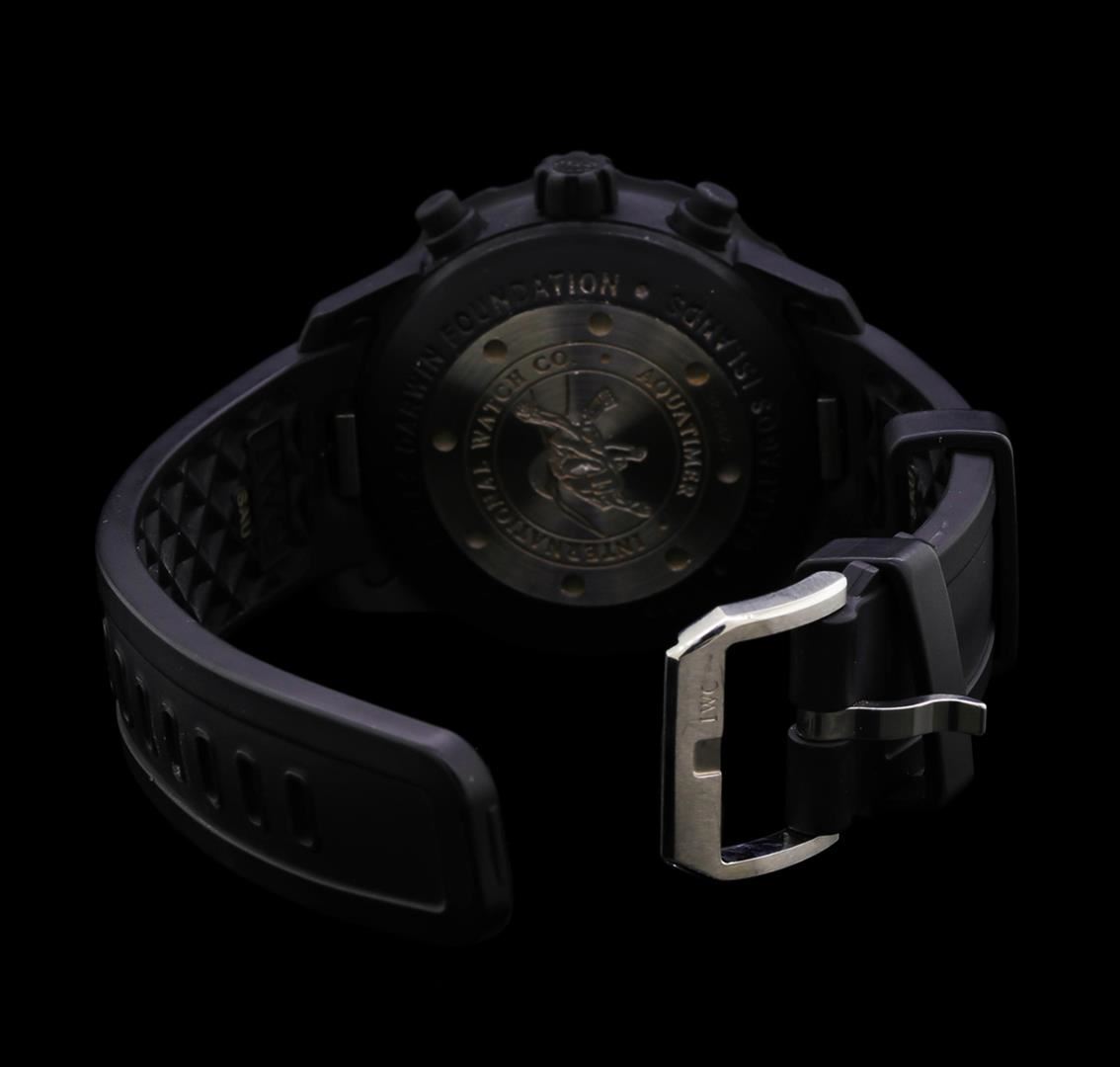 One, IWC Galapagos Aquatimer Chronograph Charles Darwin Foundation Limited Edition wristwatch, Rubber coated Stainless Steel, Case: 44mm, Water Resistant: 120 meters / 400 feet. Case Back: engraved in the rubber frame, TRIBUTE TO CHARLES DARWIN FOUNDATION, GALAPOGOS ISLANDS, additional engraving in the Stainless Steel with the manufacturer's name, model, logo, and ID numbers. IWC Logo'd Crown, Bezel: uni-directional sixty minute timer, with super luminous numerals, Crystal: synthetic sapphire lens, Movement: automatic. Power Reserve: approximately 44 hours. IWC signed Dial: Black, with luminous indices and a ringed minute track, Chronograph Functions: Sub Dials for; continuous seconds, minutes, and hours, Day/Date Window: three o'clock position, IWC Bracelet: Rubber strap, Condition: G-6 Extra Fine. Eight inch length, adjustable. IWC buckle clasp, with logo. Total Weight of Watch 138.61gm. AIG Appraised at $6,800.00.