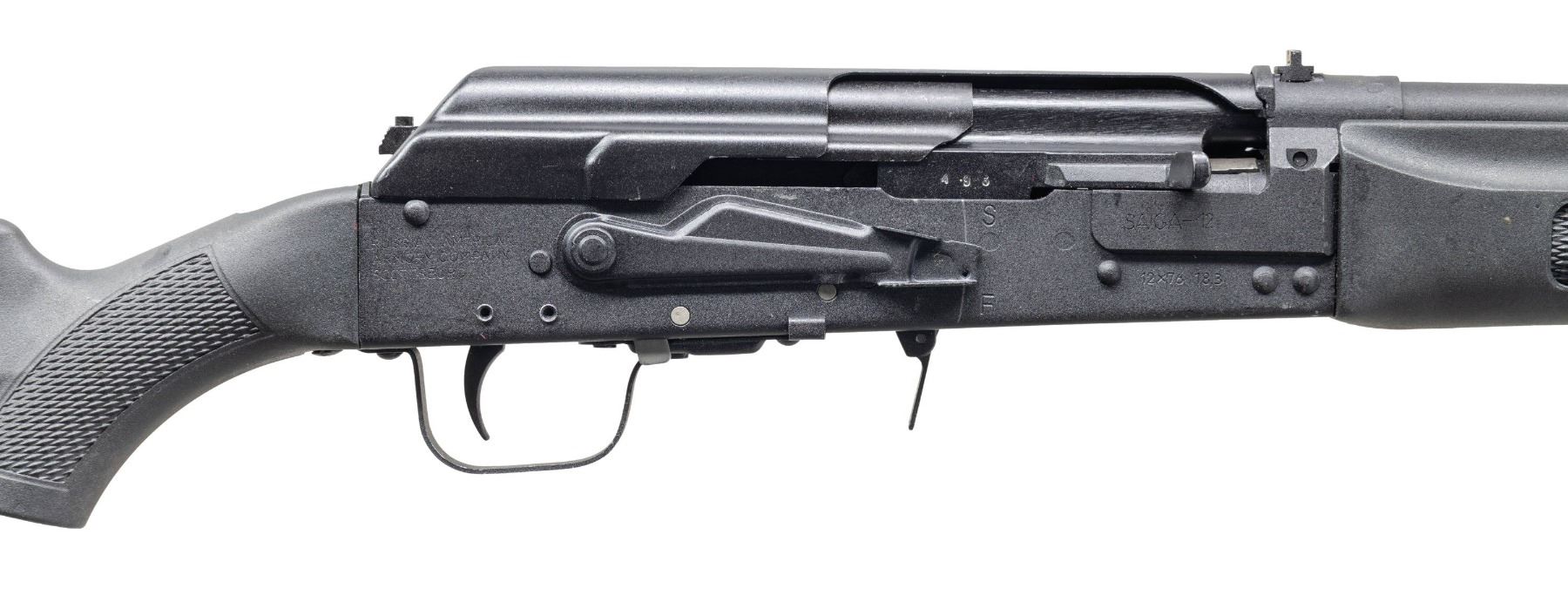 MATCHING FACTORY BOX. Cal. 12ga., 3". S# H08404493. Mfg. 2008 in Russia by Izhmash & imported by Russian American Armory Company of Scottsburg, IN. Bbl. 19". Fixed sights. US made Saiga black synthetic stock set. MAGS: 1 - 5 rd. & 1 Surefire 8 rd. UNATTACHED ACCESSORIES: matching factory box containing paperwork, cleaning accessories & Surefire choke tube. CONDITION: all aspects very good to near excellent showing light handling wear & cycling wear. Shiny bore. (25-2845/MD). MODERN. $300-500.