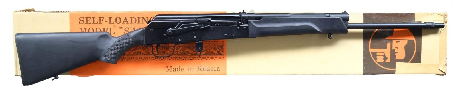 Cal. 410, 3". S# 01202652. Mfg. 2001 by Izhmash of Russia & imported by EAA Corp of Cocoa, FL. Bbl. 21 1/2" including screw on No. 3 choke. Fixed sights. AK style action w/ side rail mount. Black synthetic stock set. MAGS: 1 - 4 rd. UNATTACHED ACCESSORIES: matching numbered box containing mag. & cleaning kit. CONDITION: near excellent black metal finish & stocks. Bright shiny bore. (23-1349/MD). MODERN. $400-600.